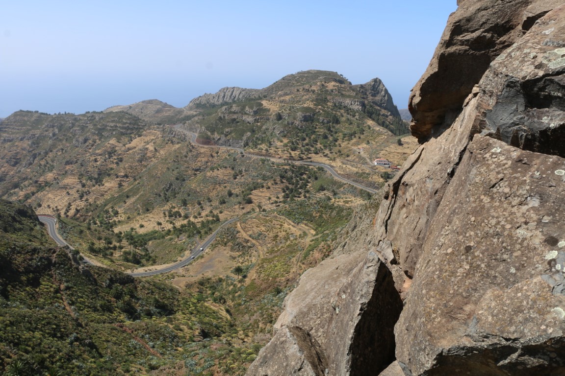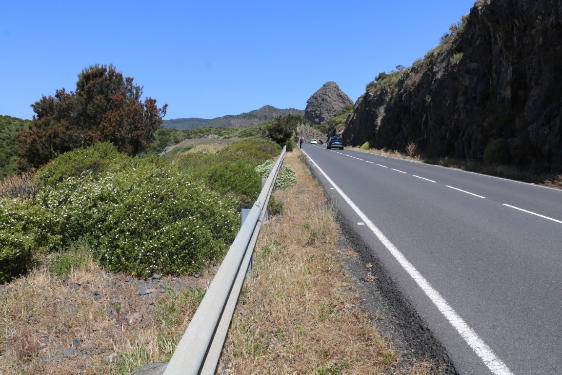 Rechtzeitig sitzen wir dann an der Haltestelle. Und die füllt sich. Mindestens ein Einheimischer setzt sich zu uns. Also: Der Bus muss kommen. Nun – 10:20 Uhr ist wohl eher so eine Angabe, vor welcher Uhrzeit er garantiert NICHT kommt. Und gegen halb elf ist er dann da. Ja – mithilfe meines vorbereiteten Zettels bekomme ich Bescheid, dieser Bus fährt nach „Calle Degollada“. (Der Weg führt auch nirgends anders hin, aber Fragen beinhaltet dann unser Ziel…) 5,- € darf die Chefin hinlegen. Dann geht es aufwärts mit uns. 950 Höhenmeter im Sitzen. Und beim Aussteigen bekommen wir noch mit auf den Weg, dass wir 160 Meter zurück müssen, da sei die Haltestelle des weiteren Busses. Gut – hatten wir schon gesehen, aber ist doch auch nett, dass er sich so um uns kümmert.