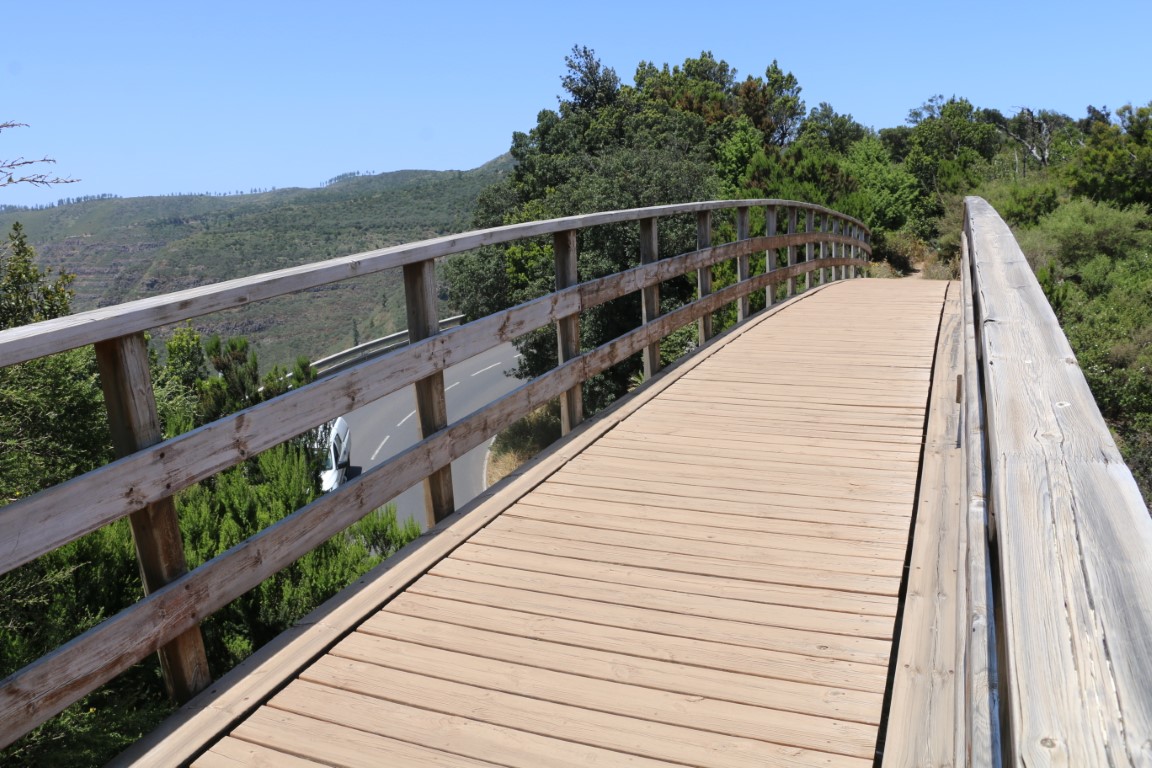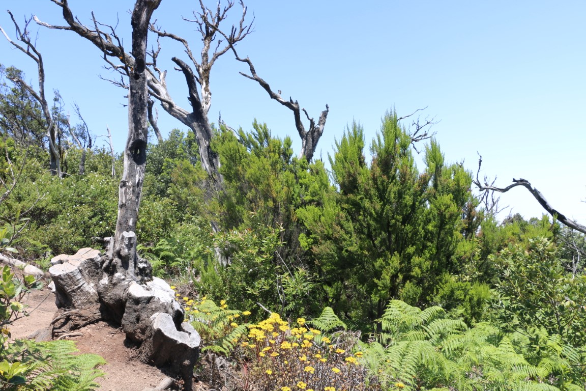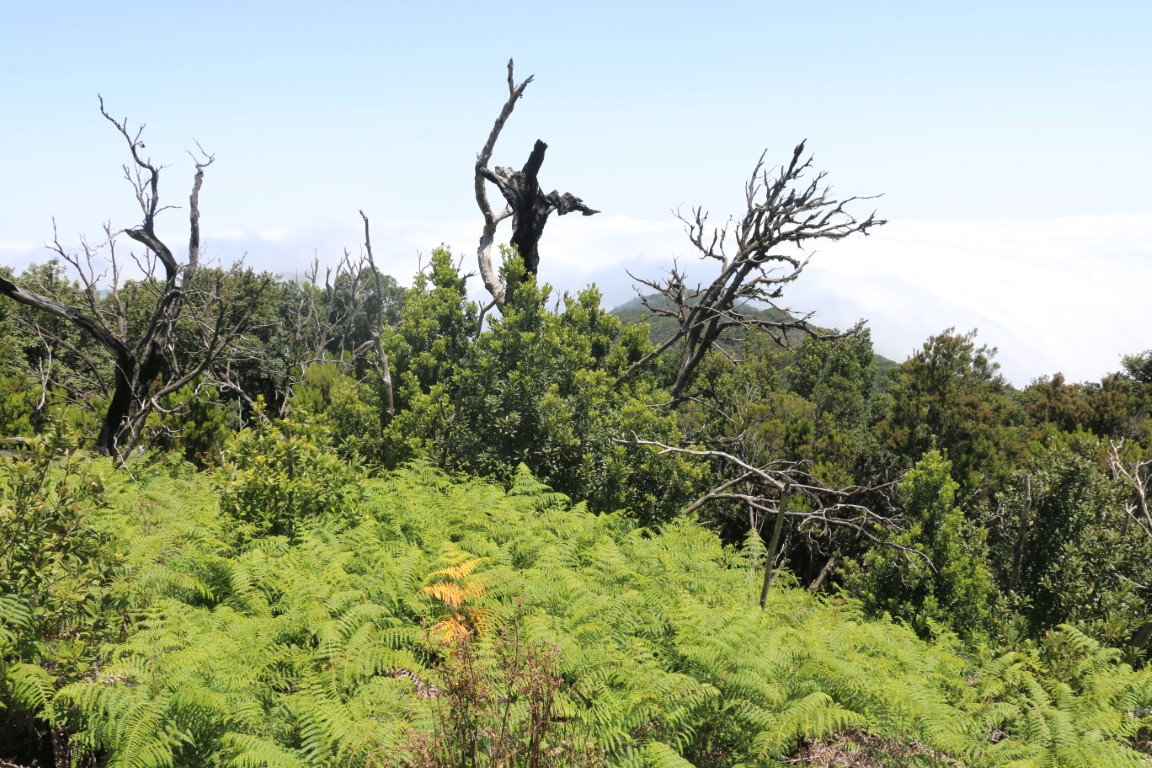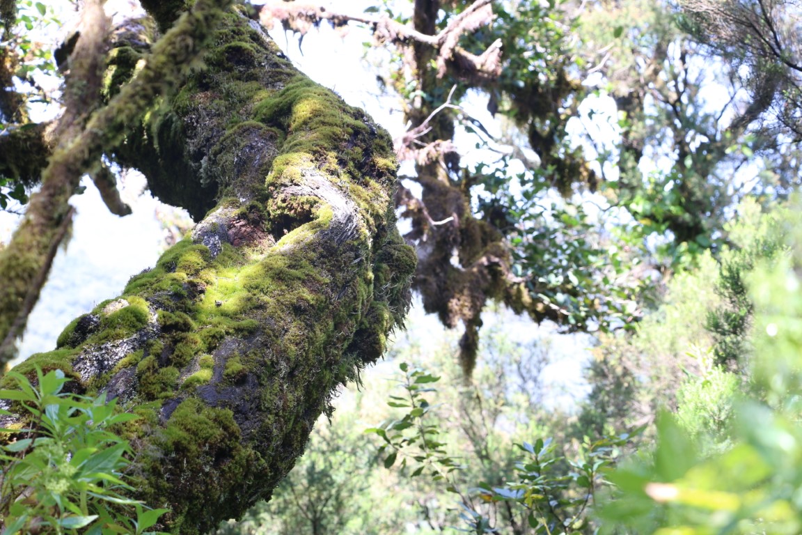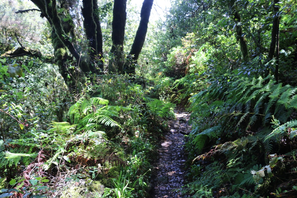 Und der Naturpark ist durchzogen von den großen Wanderwegen. Wir verlassen die Straße und gehen den GR 131. Hier ist nun nicht mehr nur grün, hier ist Urwald und deutlich feucht. Im Schatten ist angenehm. Den Wanderweg würde ich als schmalen Waldpfad bezeichnen und es gibt viel mehr Auf und Ab als auf der Straße. Anhalten tun wir natürlich nur, um Fotos zu machen, nicht weil wir erschöpft sind. Aber wenn man schon mal ein Foto macht, dann kann man auch mal tief Luft holen und ein Wasser trinken, und nach rechts schauen und nach links. Und vor und zurück. Ach ja – oben und unten gibt es auch noch. Ach – noch ein Wasser? Und dann geht es weiter, also bald, Wasser noch verpacken, noch mal schauen. Und: Wir haben jetzt ja Höhenluft, wie sind inzwischen auf 1.400 Meter! Da muss man dann noch mal tief durchatmen! Weiter!