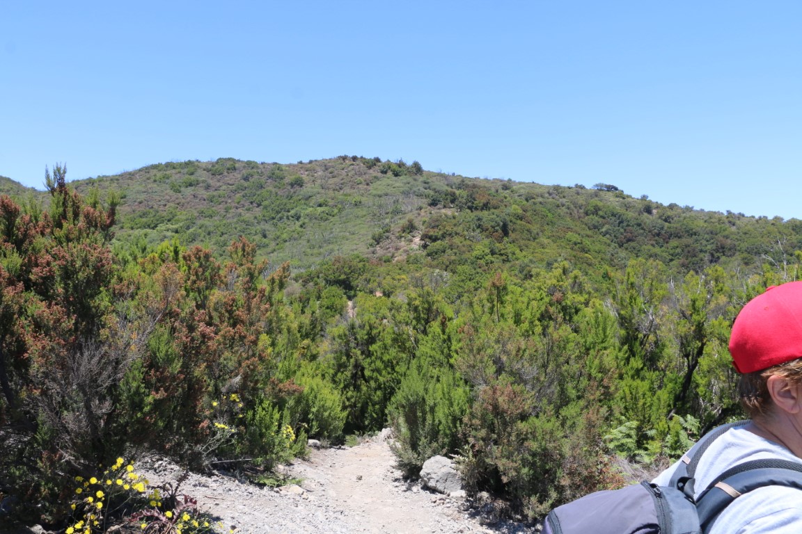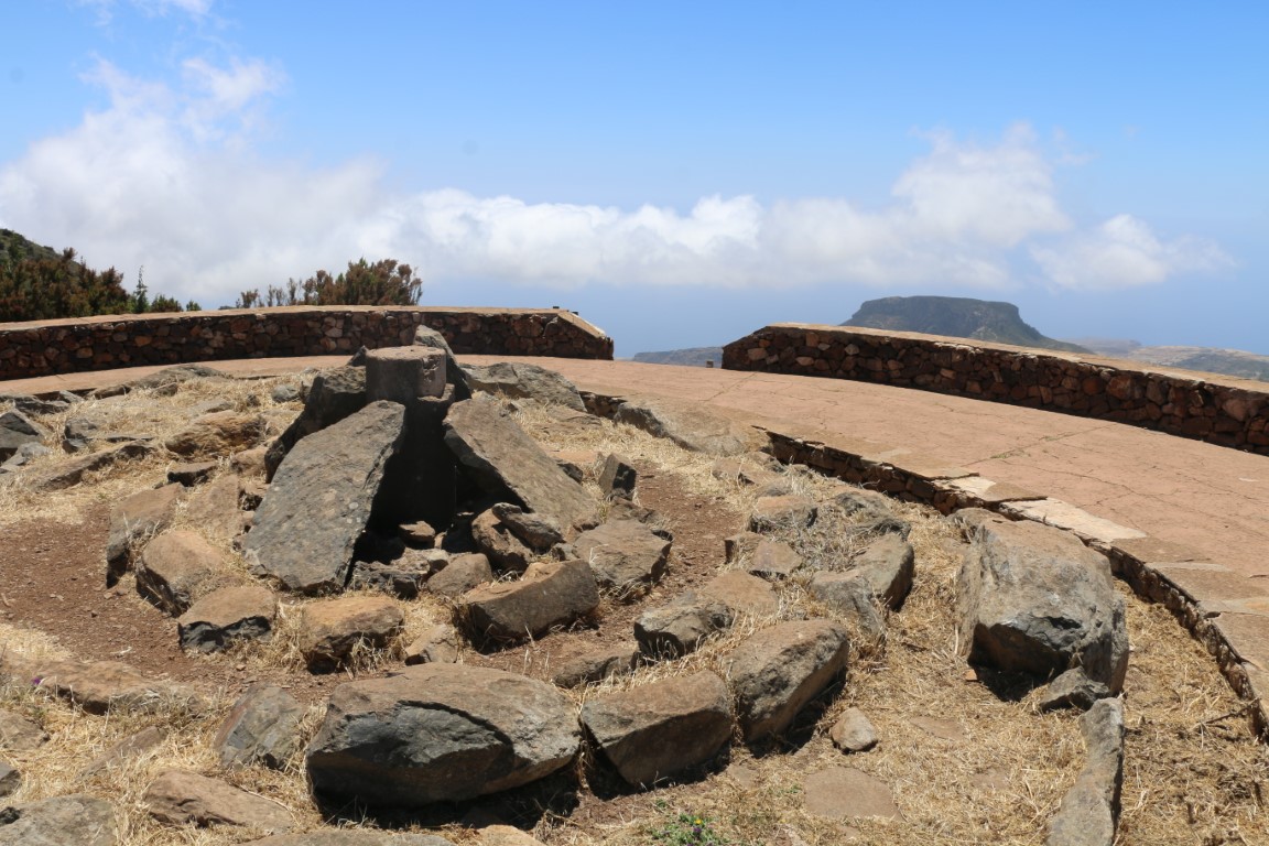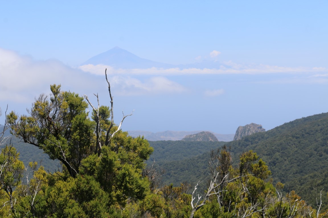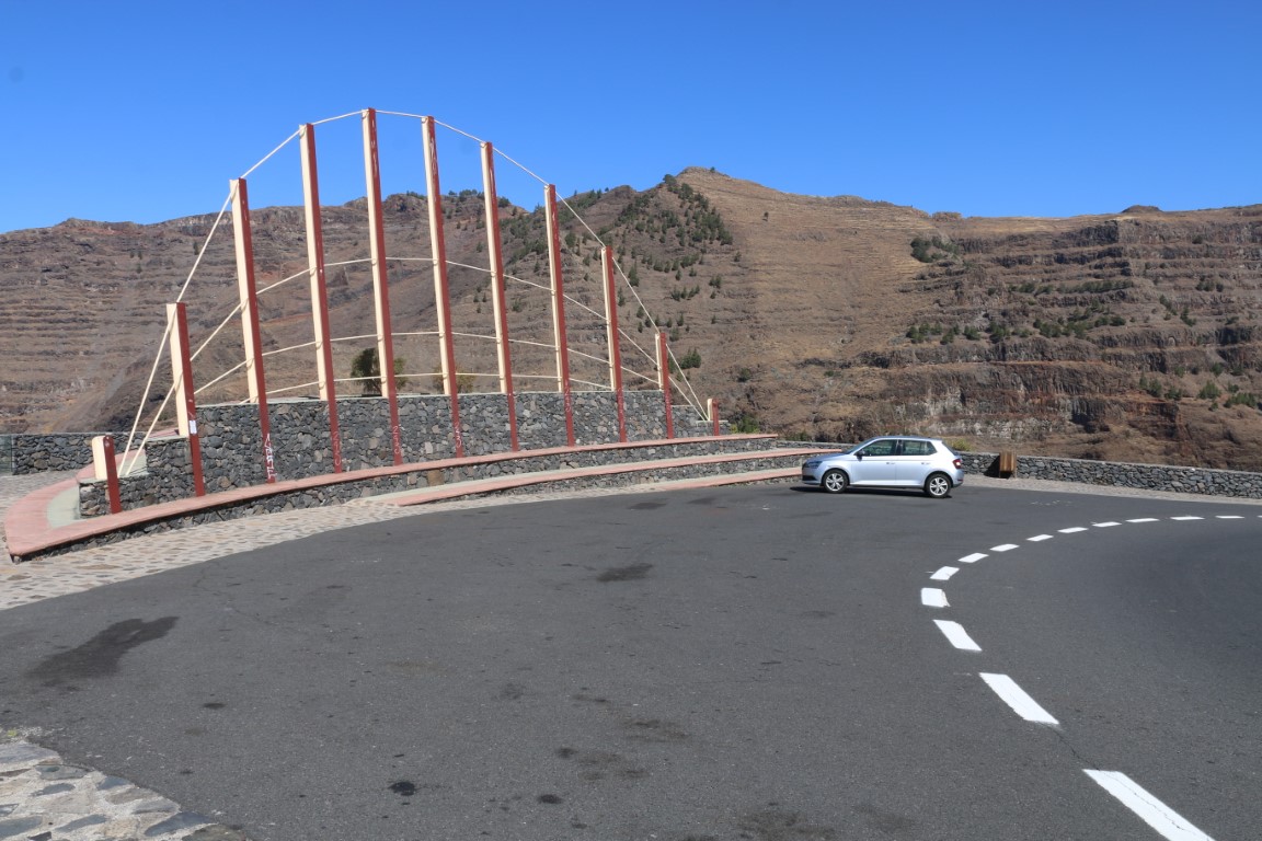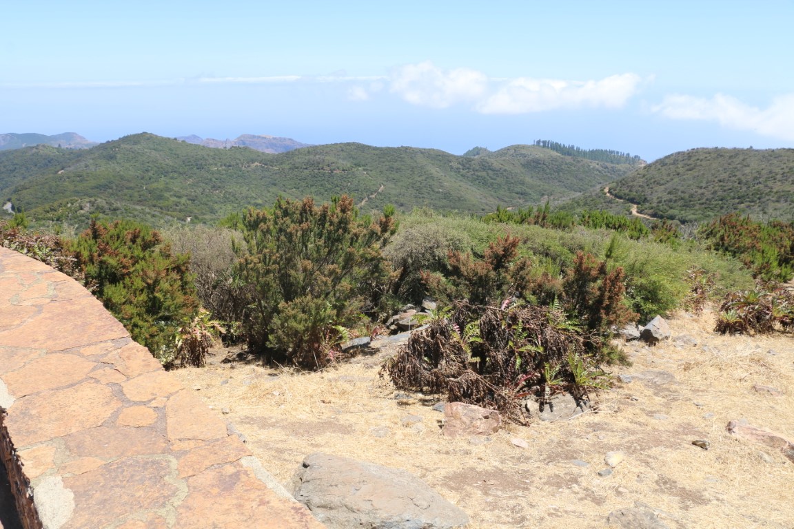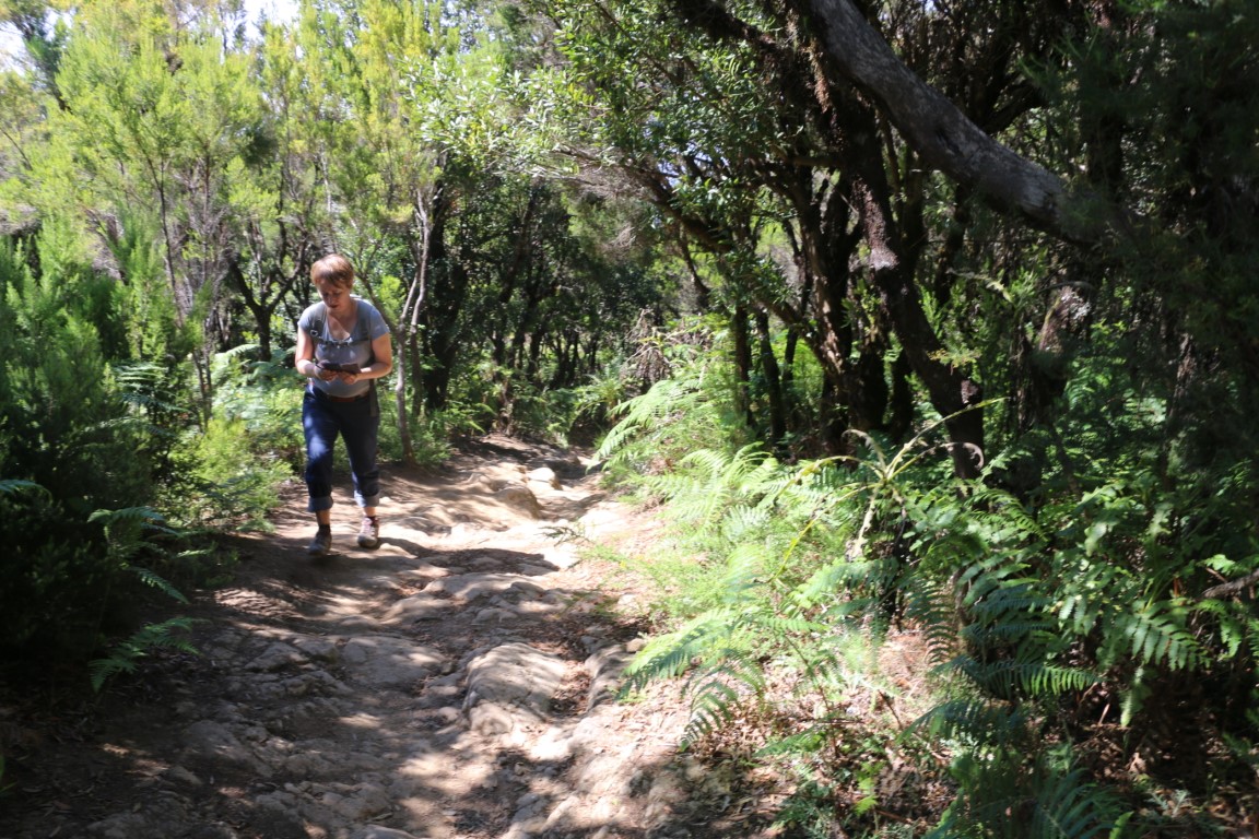 Und dann geht es endlich auf die schon lange ausgewählte Wanderung. Der höchste Berg Gomeras wird erstürmt. Oben eine alte Kult-Stätte, hergerichtet als netter Rastpunkt. Und da sehen wir dann so viele Wanderer, nicht nur Touris, sondern auch Spanier, wie sonst auf der Strecke nie! Die Runde wird dann weiter gelaufen. Breite, gepflasterte Wege wechseln sich mit schmalen Waldpfaden ab. Manchmal gibt es sogar Schatten unter Bäumen. Inzwischen ist es nämlich warm geworden. Isolde weiht ihre neue Jacke trotzdem ein. Muss ja getragen werden… Und dann endlich: Michèle bekommt ihren sehnlichsten Wunsch erfüllt: Eine Rastbank und die sogar im Schatten. Da wird dann ausgiebig eine zweite Rast gemacht. Am Ende dann noch die letzte Höhe und runter zum Auto. Reicht, war sehr nett, aber wir haben für heute genug.