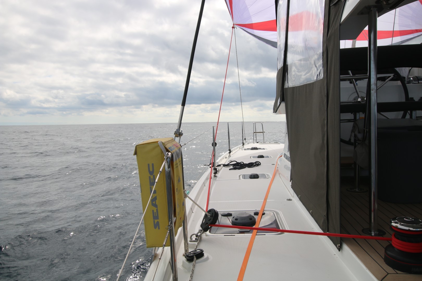 Der erste, geübte Teil des Bergens geht flott und funktioniert prima. Der Teil, in dem der Bergeschlauch nun an Deck genommen wird, läuft gar nicht. Der hängt oben im Mast fest. Gut, dass wir Maststufen haben. So kann ich geschwind hochentern. Aber Sicherung muss sein, also Michèle an das Großfall, in dem ich mich einklinken will. Da lässt Michèle den Bergeschlauch einfach runter. Problemlos. Muss sich in der Zeit, in der wir uns fertig zum Entern gemacht haben, gelöst haben. War wohl das Spinnaker-Fall, das sich auf dem letzten Meter verdreht. Sicherheitsgurt abgelegt, Para eingeholt, Motor an. Nächster Fehler erledigt!