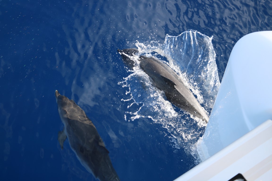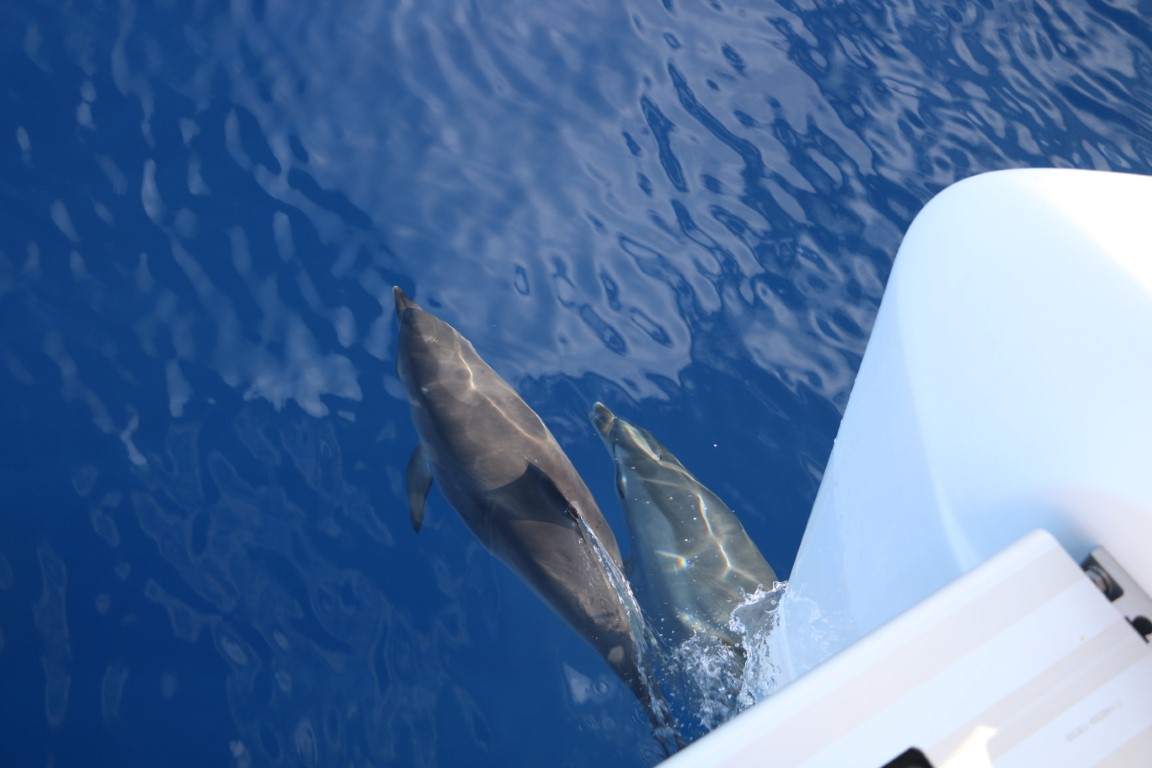 Der WaterMaker „hat fertig“ und ich kann nun weiter Filme schneiden und Beiträge schreiben. Nein – wieder Delfin-Alarm. Diese Mal aber schauen sie nur kurz nach, ob wir es noch sind und verschwinden schneller, als ich filmen kann…
