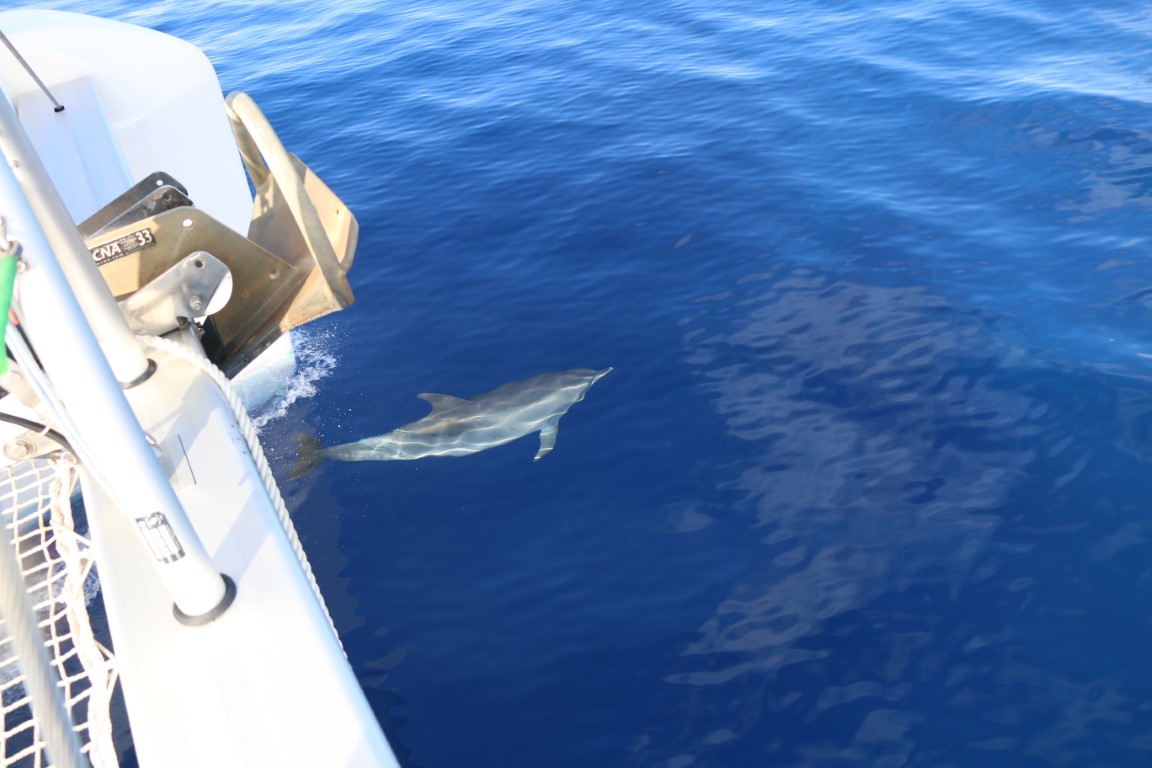 Doch kaum ist das Segel komplett oben, dreht der Wind und kommt direkt von vorn. Da könnte man abfallen (also den Kurs ein wenig weg vom Wind anlegen). Aber er hat jetzt nur noch 3 – 6 Knoten. Das bringt es nicht. Also – Segel wieder runter. Vom vielen Krach angelockt kommt Michele kurz an Oberdeck. Verkündet aber, dass sie weiter schlafen will. Kaum ist alles schön eingepackt, da springen Delfine vor den Bug! Prima, ab in den Bugkorb. Die Delfine scheinen länger bleiben zu wollen. So klopfe ich wie wild aufs Oberdeck und richtig – Michèle kommt und freut sich mit mir! Es bleibt sogar Zeit die Kamera rauszuholen. Das Filmchen gibt es unten zu sehen!