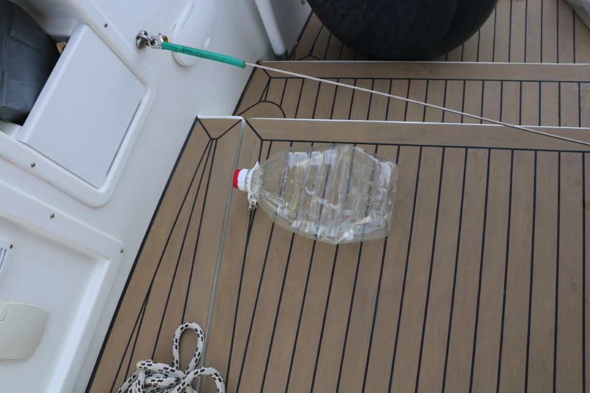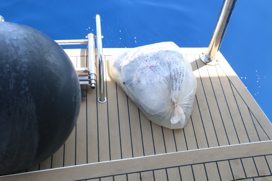 Und das Ausschau halten bringt dann neue Action: Einen Wal sehen wir nicht. Aber Plastik. Gut – gemäß den Verhaltensbitten des TO (TransOcean) wollen wir das „fangen“: Catch of the day! Kursänderung, Ketcher klar machen, aufstoppen und einfangen. Kaum sind wir wieder auf Kurs: Plastik! Das Spiel beginnt von vorne. Diese mal ist es eine wohlgefüllte Mülltüte. Und was soll ich sagen? Kaum sind wir wieder auf Kurs: Plastik! Das Spiel beginnt noch mal von vorne. Diese mal ist es wieder eine Plastik-Flasche. So spiegelglatte See und Ausschau halten hat schon so seine Nachteile. Kaum auf Kurs … Doch dieses Mal ist die von Michèle entdeckte Flasche achteraus. Da entscheide ich: Nee – wenn wir jetzt anfangen zurück zu fahren, dann kommen wir wieder nach La Gomera. Das will ich nicht! Bis querab. Mehr wird nicht eingesammelt!