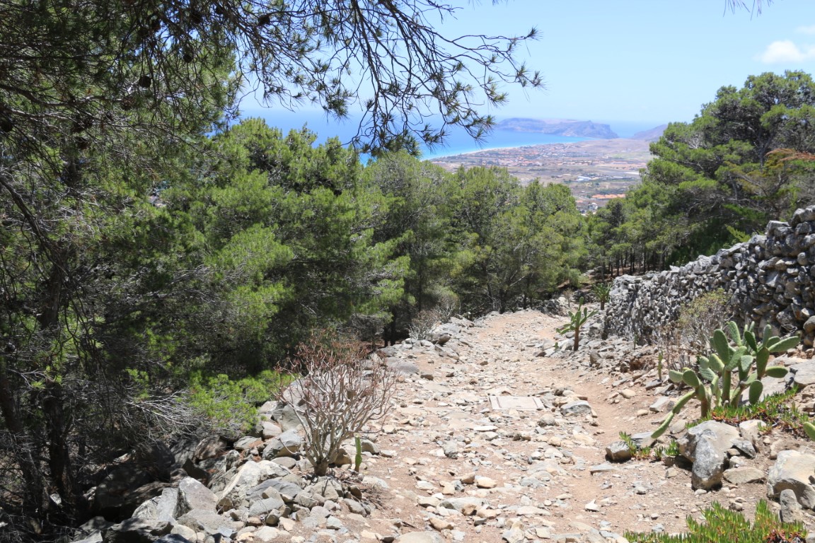 Schon auf dem Abmarsch großes Treffen: Erst Herry, der gerade Müll wegbringt. Dann auf der langen Gerade Renèe und Hans. Und dann Peter mit seinem Mitsegler. Jedes Mal wird ein Schwätzchen gehalten. Alle abgearbeitet. Dann geht es nach rechts in die Steigung. Teile des Weges kennen wir noch aus der ersten Besteigung des Pico Castello vor über einem Jahr. Doch hier und da gibt Komoot einige Wanderwege „querfeldein“ vor. Da verlassen wir die Straße.