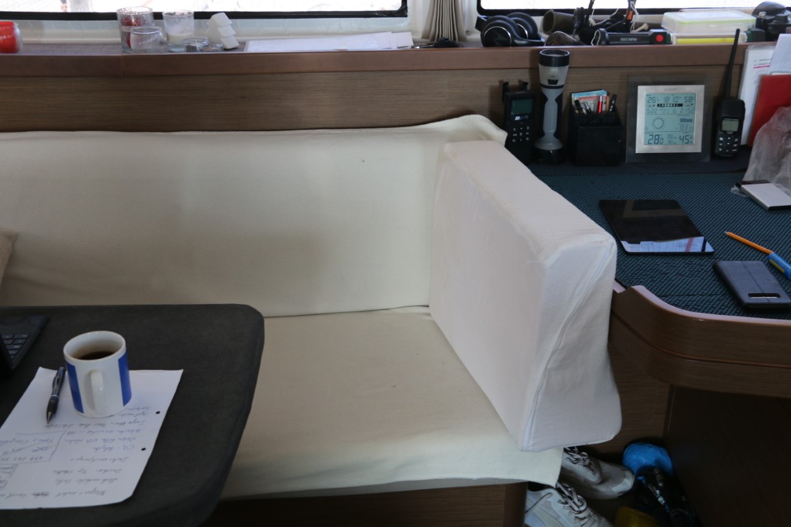 Neben dem Sonnenschutz habe ich noch ein anderes „Näh-Projekt“. Im Salon steht schon seit Langem eine variable Rückenlehne. Einfach in ein ehemaligen Kopfkissenbezug gestopft. Der soll nun „in Form“ gebracht werden. Lösung A: Zur Näherin bringen, die hatte schon die Lehne für die Maststütze so schön gemacht. Oder Lösung B: Selbst machen. Ich entscheide mich für …..