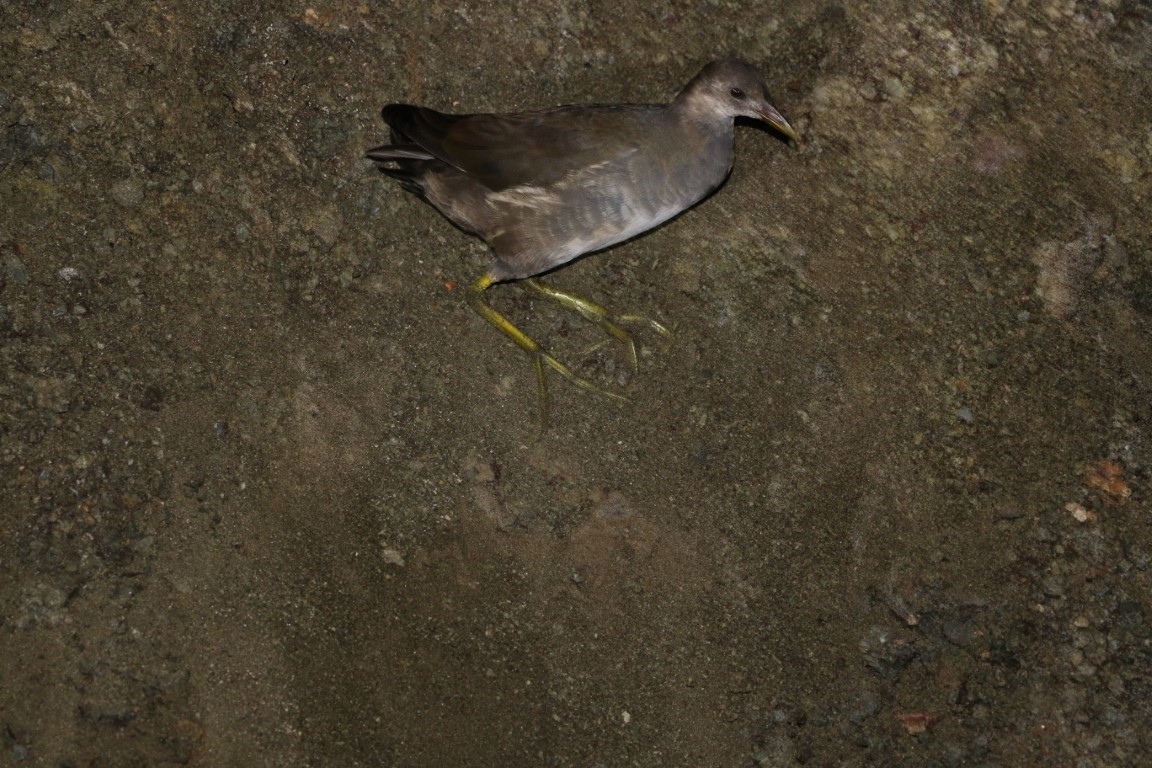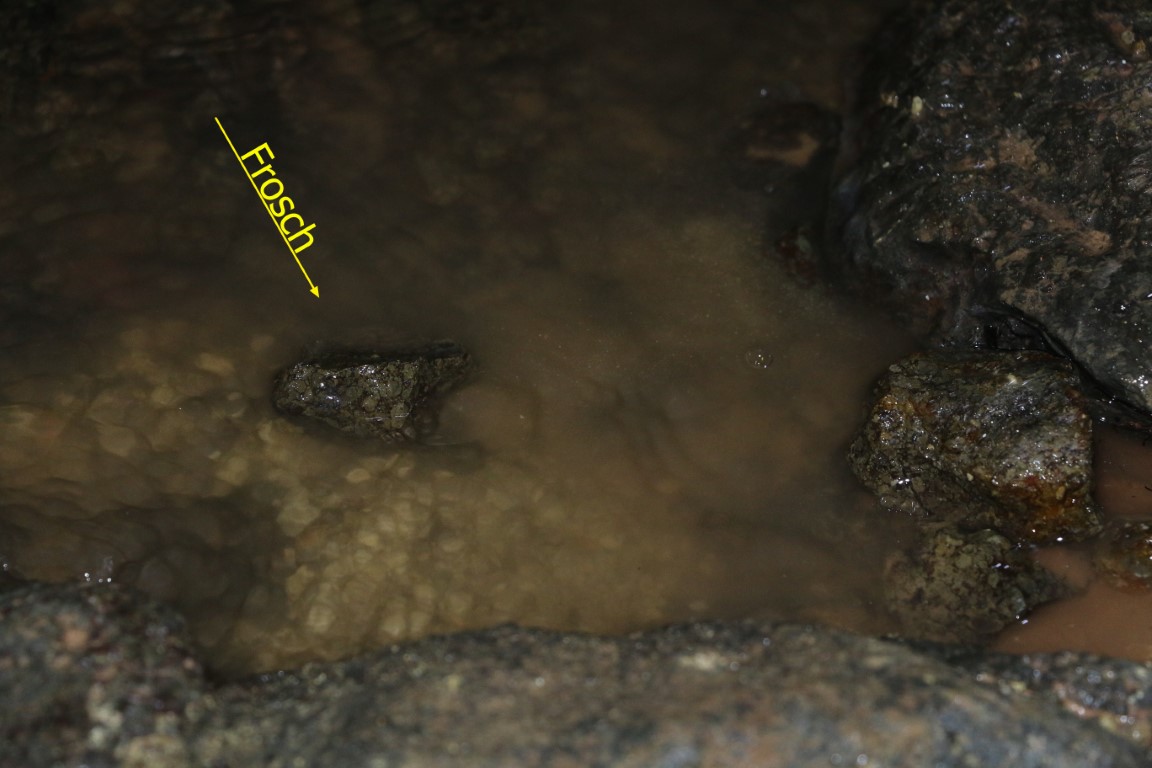Schon nach den ersten Metern das erste große „Huch“: Ein kleines Hühnchen (?) betrachtet den Tunnel wohl als Stall. Nicht viel weiter der erste Frosch! Wenig Spinnen und Motten. Nach einer kaum wahrnehmbaren Biegung machen wir alle unsere Lampen aus. Stockdunkel! Nicht ganz – zurück blickend sehen wir zwei rote Flecken! Meine Vermutung, Widerschein des Einganges bewahrheiteten sich nicht. Aber was es nun wirklich war, konnten wir nicht heraus finden.