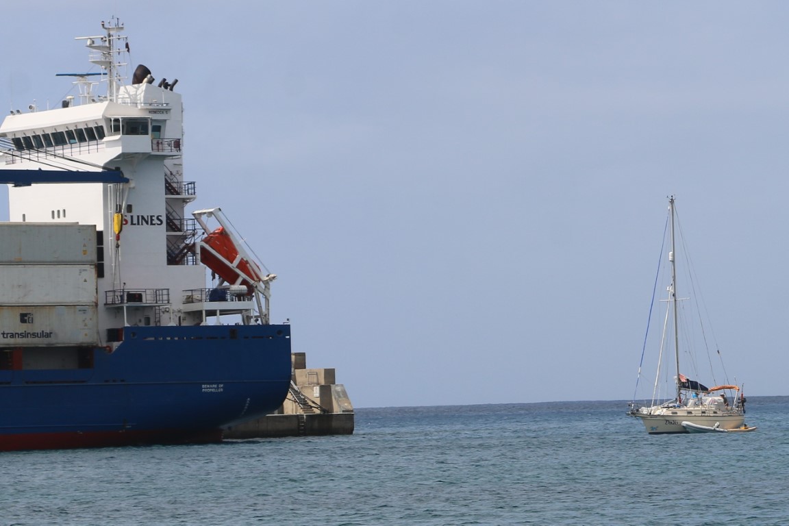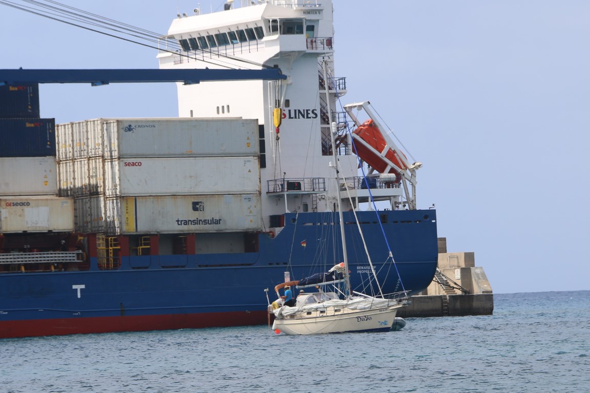 Kurz vor 12 war es dann so weit. Ich springe ins Schlauchboot und fahre noch schnell bei Peter / SURPRISE vorbei und will ihn ankündigen. Dass er längsseits kommen darf, hatte ich gestern schon mit Peter verabredet. Gut – der ist nicht da, also raus aus dem Hafen und Yoshi entgegen. Doch in der Hafeneinfahrt ist großes Manöver. Ein Schlepper aus Madeira hilft dem Fracher, der alle 2 oder 3 Wochen kommt, anzulegen. Mit dem Schlauchboot kann ich mich zwischendurch quetschen. Eigentlich will Yohi in der Hafeneinfahrt das Segel runter nehmen. Das wird so nichts!