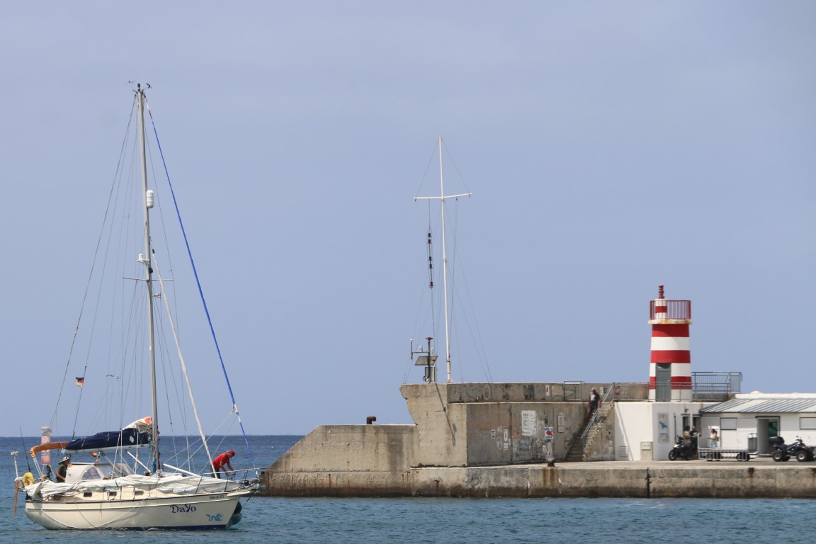 Vor mir prescht die GNR Yoshi entgegen. Ich hatte ihn über Funk schon gewarnt, die Flagge „Q“ bereit zu halten. Die bedeutet: Ich bitte um Erlaubnis einzulaufen, an Bord ist alles wohl. Und so nebenbei: Ich habe mich noch nicht einklariert. Heute sind „gnädige“ GNRler in dem Schlauchboot und mit dem Hinweis, dass er nachmittags zum Einklarieren ins Büro kommt, lassen sie ihn dann zufrieden. Nun bin ich dran – längsseits gehen und aufentern. Im Heckbereich schleppt er ein Board mit. Aber darüber denke ich nicht viel nach. Vor dem Bord bedeutet er mir, soll ich festmachen und hoch kommen. An Deck will ich Yoshi begrüßen. Doch – das ist Fred von der GUANCHA. Der ist Yoshi entgegengepaddelt und von ihm stammt das Board! Super – nun sind wir zu dritt, da ist das Hafenmanöver dann ein Kinderspiel.