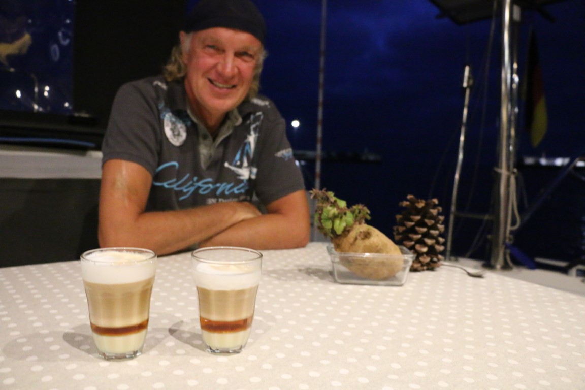 Abends ist Yoshi dann bereit und kocht uns Dinkelnudeln an „Flensburger Bolognese“. Und zum Abschluss gibt es den ersten bordgemachten „Barraquito“. Gar nicht schlecht gelungen, er mundet uns prima!