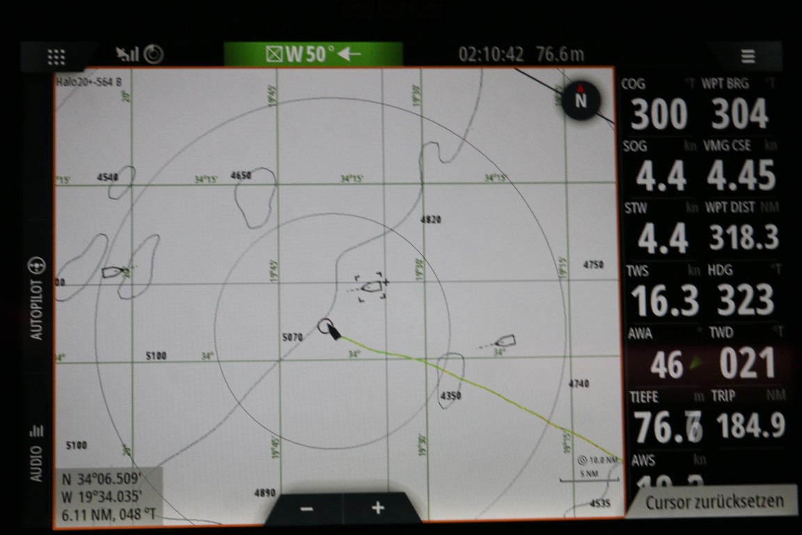 Nachts komm ich nicht wirklich zum Schlafen. Gegen Mitternacht erscheint – noch über 20 Meilen entfernt – ein Schiff im AIS. Und dann noch eins und aus der Gegenrichtung das nächste. Natürlich bin ich in der Mitte, auf die alle zufahren. So stelle ich mit zunächst den Wecker auf 30 Minuten. Kann aber nicht einschlafen. Als es klingelt sind die Schifflein näher, aber immer noch gut auf Kollisionskurs. Ich nehme den Übersegler: Ja – ich bin auf der „Autobahn Gibraltar – Florida“: Der Erste passiert mich kurz nach 2 Uhr in sicherer Entfernung. Der hinter ihm scheint schon rechtzeitig den Kurs ein wenig geändert zu haben, aber: Kontrolle ist besser als Vertrauen. Positiv formuliert: Ich lese innerhalb von zwei Tagen / Nächten ein Buch (James Patterson – gute Thriller!). Anders ausgedrückt: Ich finde nicht die Ruhe für eine längere Schlafpause. Der Dritte geht auch in sicherer Entfernung hinter mir durch. Nun ist „die Kimm wieder klar“.
