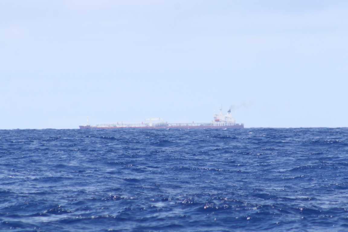 Kurz vor 16 Uhr ist es so weit. Die Alora erreicht ihren nächsten Punkt (CPA = Closest Point of Approach). Es ist ein Tanker, registriert in Singapure, mit 228 m Länge und 32 m Breite unterwegs nach Florida. Da will sie am 26.07. um 14:00 Uhr ankommen. So fährt sie mit 11 kn, das ist wohl eine ökonomische Fahrtstufe. Kommt mir bis auf 5,5 Meilen „nahe“. Das ist eine Entfernung, in der ich sie gut sehen kann, die aber überhaupt keine Ängste auslöst. Ich habe sie einmal mit 600er Tele aufgenommen und einmal mit ein wenig RE, so dass das Bild einen Eindruck gibt, wie wenig man den Tanker sieht.