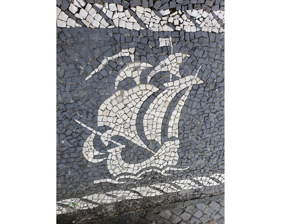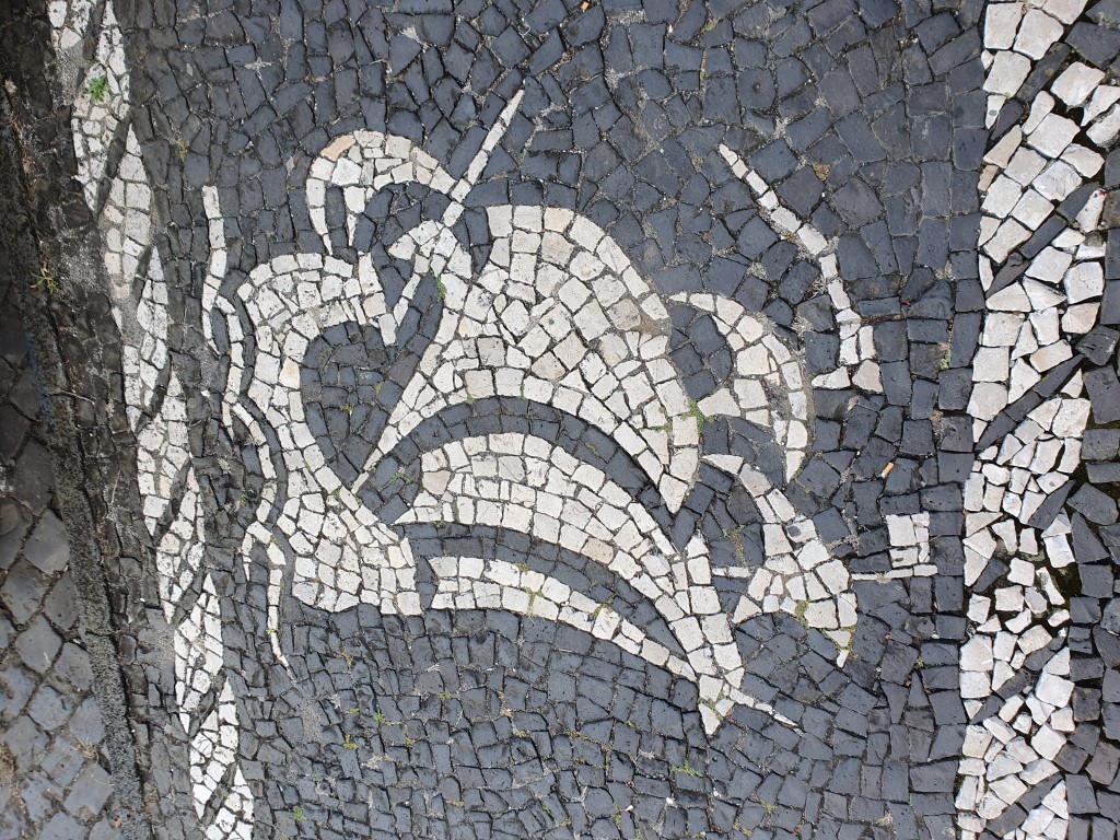 Herry & Helga nehmen mich dann im Auto mit hoch in die Stadt. Ich hole ein Baguette, etwas Obst und ein paar Hähnchenteile fürs Abendessen. Der Weg zurück geht bergab. Und ich bin der Meinung, so stark ist die Steigung nicht. Werde ich mal sehen, wie es aufwärts ist. Das Städtchen ist nett, sehr entspannt und ruhig. Etwas älter und ein Straßendorf. Ich fühle mich wohl. Ach ja – wieder sind die Wege mit Mosaiken ausgelegt! Ich bin mir nicht sicher, denke aber, da muss man einen Drachentöter sehen! Sind schließlich keine Wale, Marias oder Schiffe! Beim Drehen für die Homepage bemerke ich: Es sind doch Schiffe!