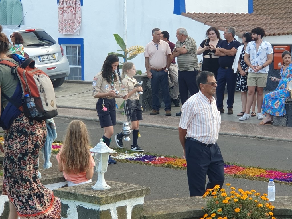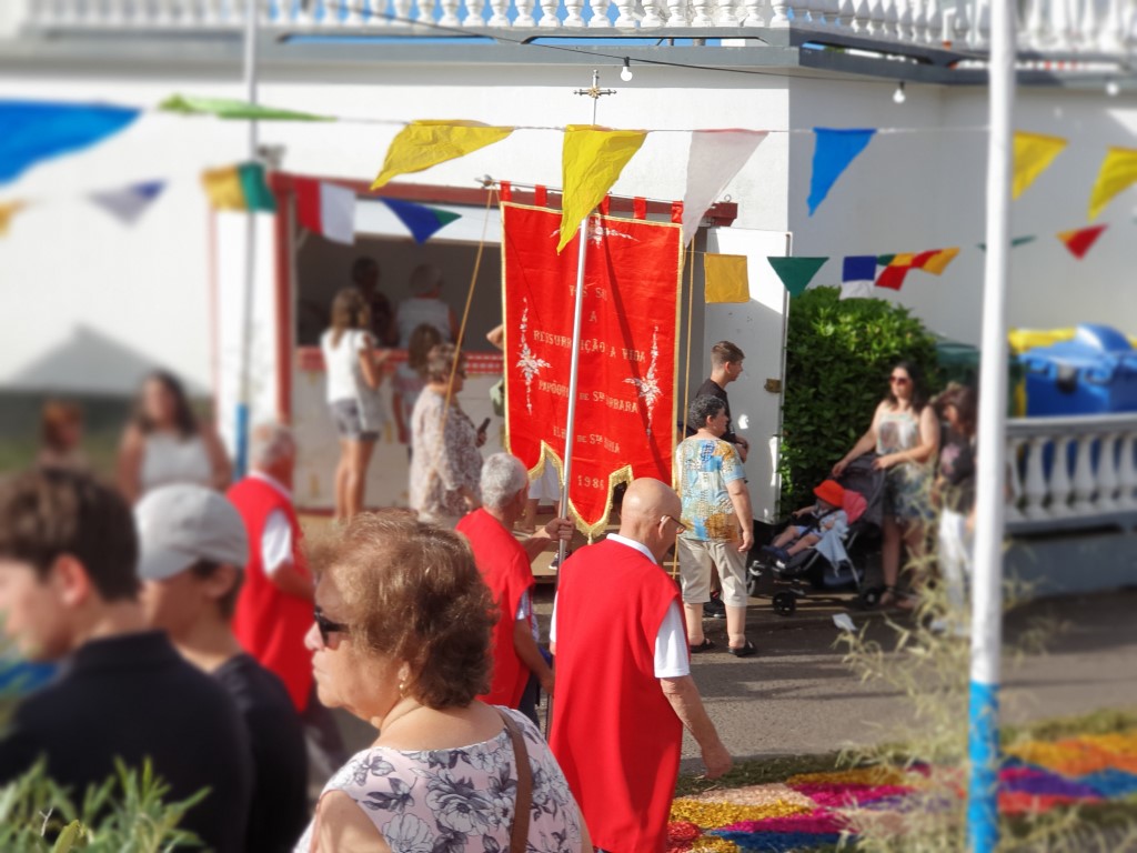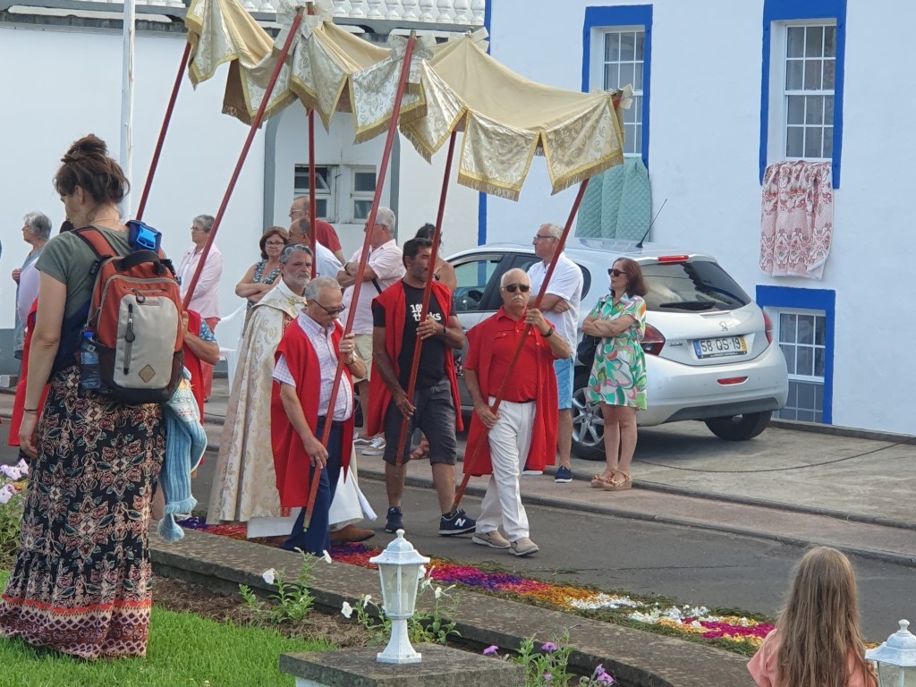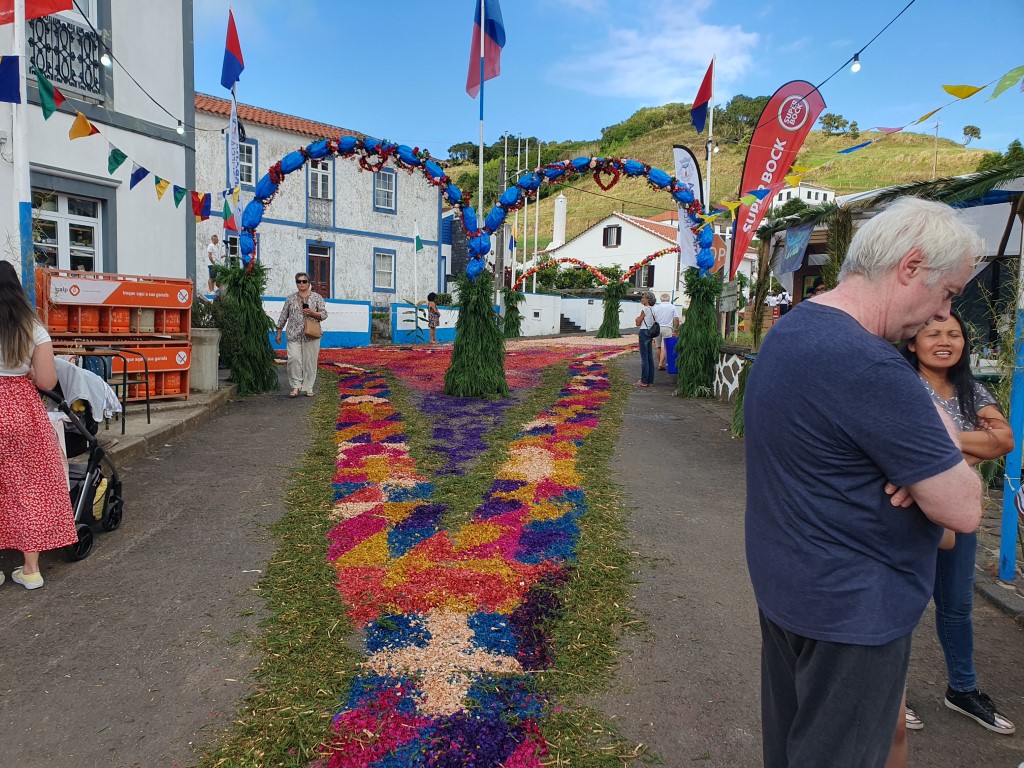 Schon auf dem Hinweg bin ich begeistert: Die haben die ganze Stadt mit Blüten ausgelegt. Aber nicht einfach nur Blüten auf die Straße gelegt, nein, wunderschöne Muster. Herzen und Kreuze, mit Nadelgrün umgrenzt. Die Bilder zeigen das wohl ganz gut.
