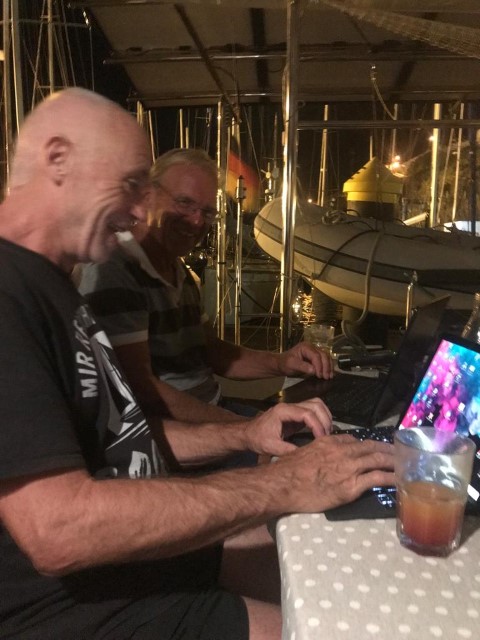 Dann können wir endlich in Ruhe zum wesentlichen Teil des Abends kommen: Derk möchte sehen, wie ich auf See "Wetter mache". Also: Wie geht das mit einer Mail Grip-Daten zu bekommen und wie schaue ich mir dann die Grip-Daten an. So hacken wir auf unseren Rechnern rum, vergessen aber auch zwischendurch unsere Cocktails nicht.