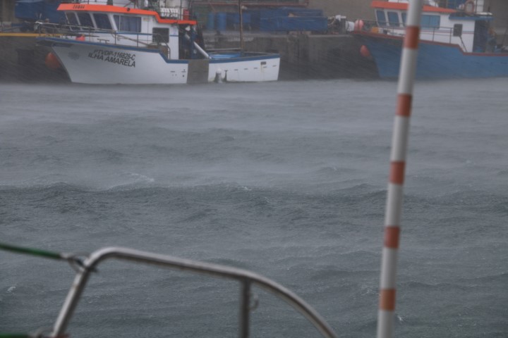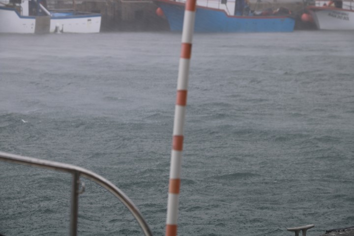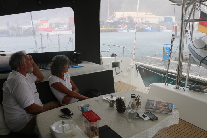 Nachmittags kommt erst Herry vorbei. Wir schauen in strömenden Regen. Auf der Terrasse lässt es sich aushalten. Die Temperatur ist 26 – 27°. Als dann Helgas Portugiesisch-Kurs vorbei ist, kommen beide zum Seemanns-Sonntag. Böen peitschen das Wasser im Hafen zu kleinen Wellen auf, der prasselnde Regen hält sie nieder. Selbst im Windschatten werden wir nass und verziehen uns in den Salon!