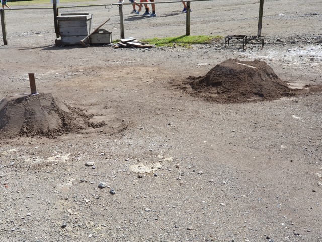 Um 15 Uhr dann das nächste Briefing: Wir fahren noch hoch an den See. Ja – hoch zum See! Das ist der wassergefüllte Krater. Am Rand eine Stelle, die sehr heiß ist. Dort garen eine Menge Restaurants ihren Eintopf. Aber man kann auch für eine private Feier einen Topf in die Röhren stellen. Dann kommt ein Holzdeckel drauf und alles wird mit Vulkan-Erde bedeckt. 6 Stunden später ist es gar! Natürlich ist es nicht ganz so einfach, wird uns erklärt. Man muss schon wissen, wie man die Zutaten schichtet und wie viel Wasser dazu gegeben wird, dass es gar, aber nicht zerkocht ist, so wird uns erklärt.