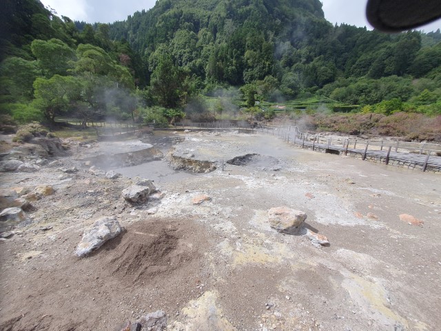 Furnas hatten wir schon beim letzten Sao Miguel-Aufenthalt besucht. Doch durch den Park „Terra Nostra“ sind wir nicht gegangen. Heftiger Eintritt und genügend andere Tagespunkte hatten uns damals abgehalten. Heute und in der Gruppe bekommen wir den Eintritt ermäßigt. Und so wandern wir durch den Park und springen anschließend in das Thermalbad. Herrlich warm. Und schwefelig. Und ganz viel Eisen in dem Wasser. Undurchsichtig rot-braun. In eineinhalb Meter Tiefe schon dunkel! Und wem es zu warm wurde, der hob den Kopf aus dem Wasser und ließ den kühlen Regen auf sein Haupt prasseln. Zeitlich passte es, noch einen kleinen Snack zu sich zu nehmen. Und in dem Cafè, das wir aussuchen, saßen da wieder eine Menge unserer Gruppe. Und dann kam die Nachricht: Abfahrt eine Stunde nach hinten verschoben, Wetter bessert sich vielleicht später!