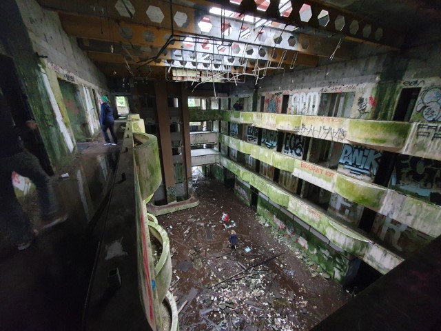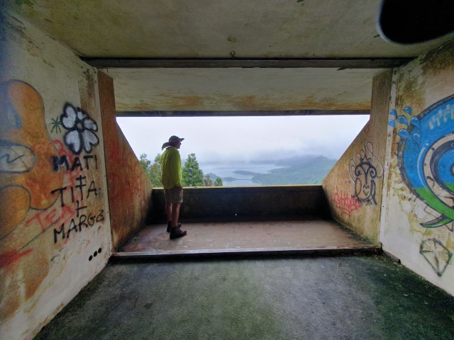 Dann geht es nach Westen: Sete Cidade ist das nächste Ziel. Da waren wir letztes Jahr schon mal. Heute etwas fauler: Wir fahren mit dem Bus an den höchsten Punkt, zur einen Seite der Atlantik, zur anderen die beiden Seen: Der Grüne und der Blaue. Heute sind beide nur grau. Aber für mich ein Highlight. Wir schauen uns die Hotel-Ruine von innen an. Es war ja als Luxus-Investition gedacht. Nur: An 200 Tagen im Jahr sieht man weder den Atlantik noch die beiden Seen. Sondern nur Nebel!