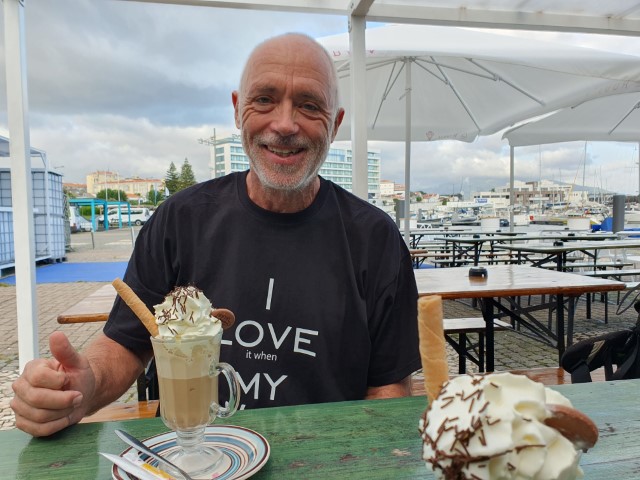 Die Gleitschirme wegbringen und sich aufhübschen für den Abend. Lukas kennt ein Cafe am Hafen, das wunderbare Cappuccino macht. Prima kleiner Zwischenstopp!