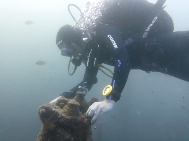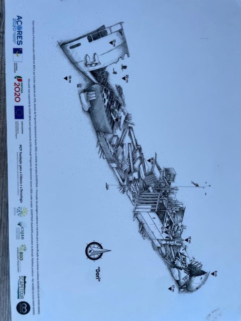 Letzten Einkauf, Lukas an Bord nehmen, Boot seeklar machen, bei der Immigration und dem GNR abmelden. Da ist das Restaurant mit den netten Cappuccini. Haben wir natürlich noch einen bekommen. Und dann auslaufen, die Boje vom Wrack suchen und außerhalb der Verbotszone ankern. Inzwischen ist es bald 17 Uhr und wir machen uns tauchklar. Im Dinghy zur Boje – die ist inzwischen frei, die letzte Taucherschule hat Feierabend gemacht.