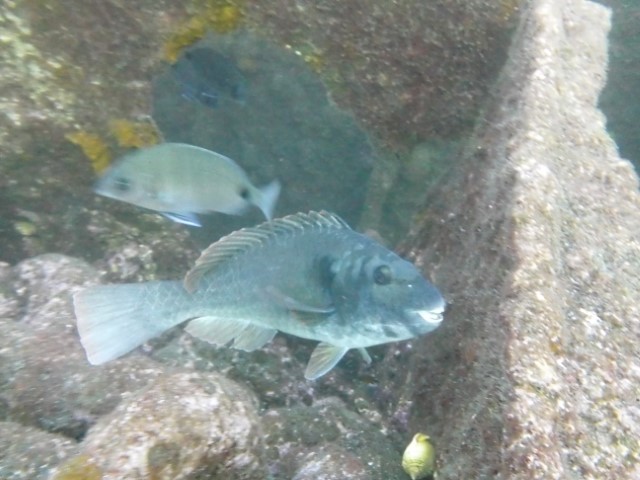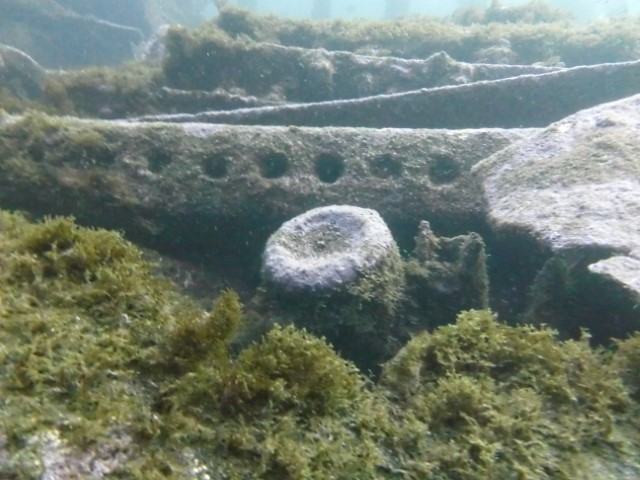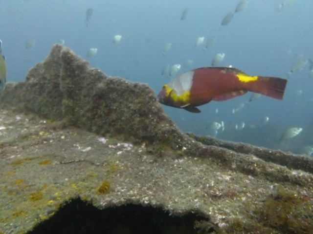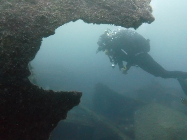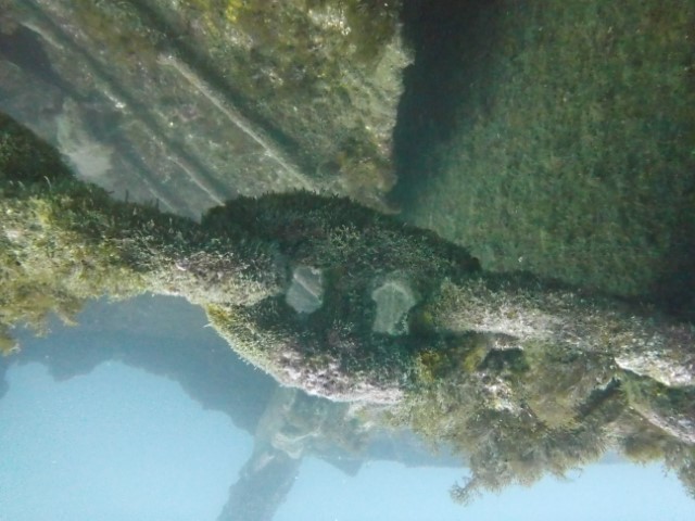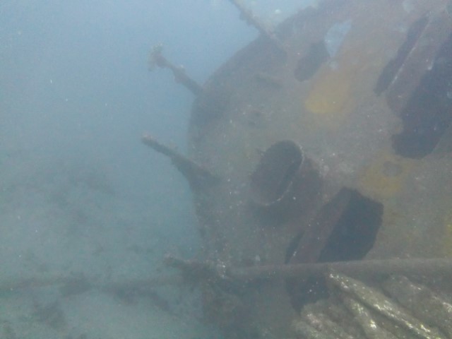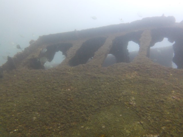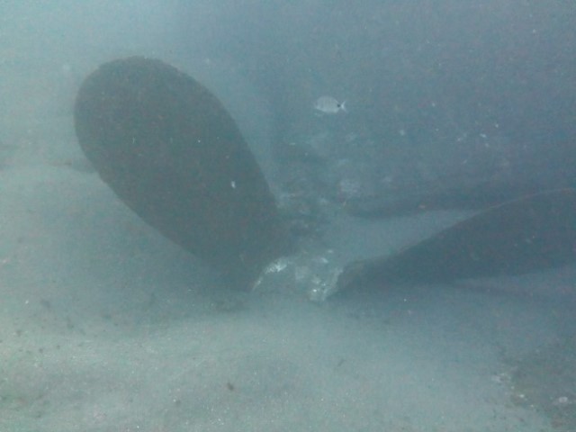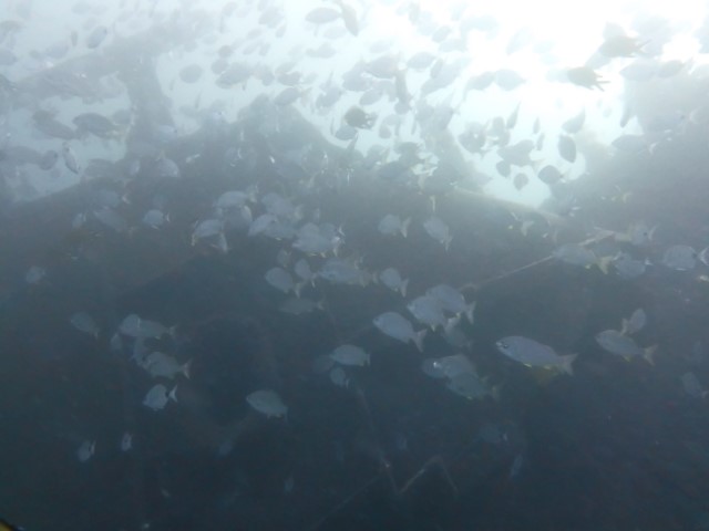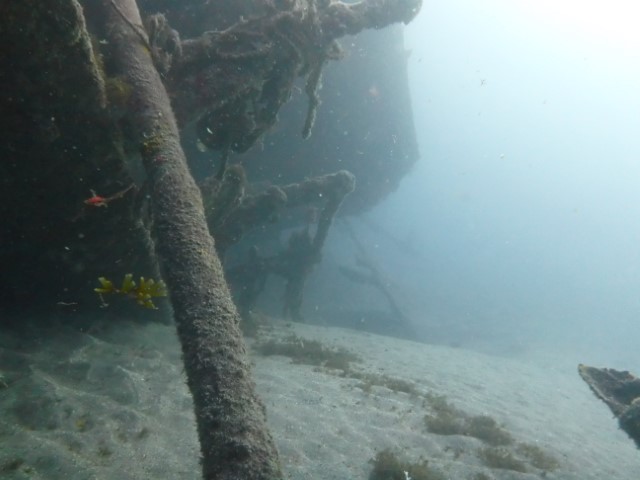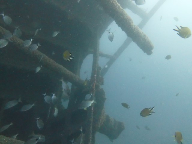 Abtauchen, Grund auf ca. 18 m. Sicht ist schlecht, aber am Rande des Sichtfeldes ist es etwas dunkler: Das muss das Wrack sein. Ein 140 m langer Frachter, vor 60 Jahren durfte er nicht in den Hafen einlaufen, da sie Angst hatten, dass er ihnen im Hafen absäuft. Und so liegt er nun kurz vor der Hafeneinfahrt und ist ein Paradies für Fische und Taucher. Manche Teile sind noch gut erhalten, man hat eine Menge zu sehen und einen netten Dreiviertel-Stunden-Tauchgang. Die Bilder mögen für sich sprechen, den Film hat Lukas gemacht.
