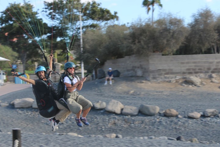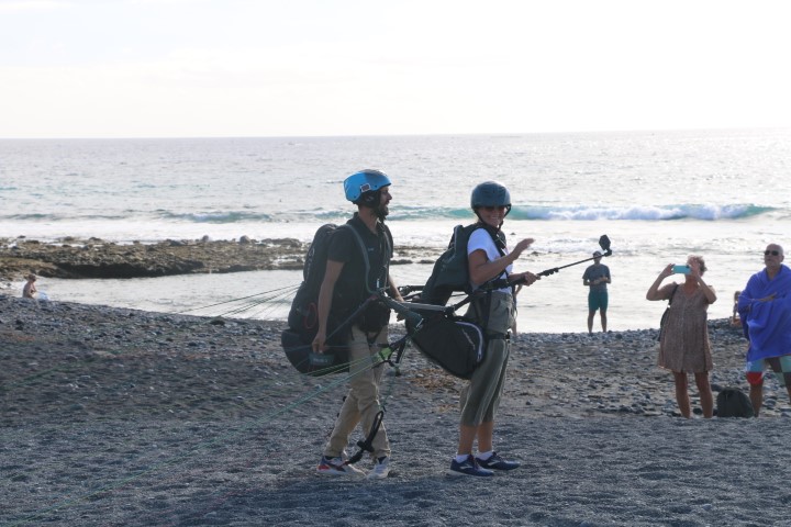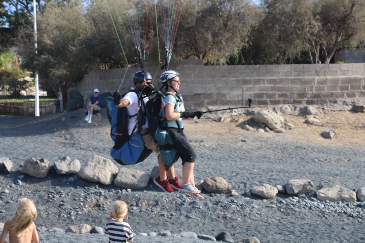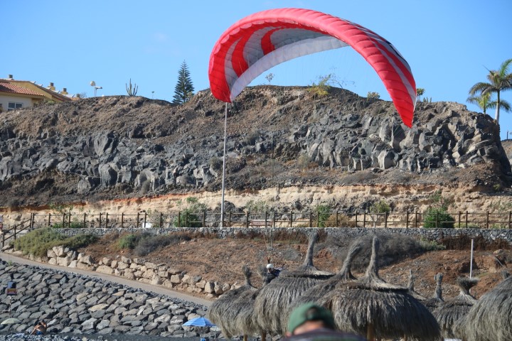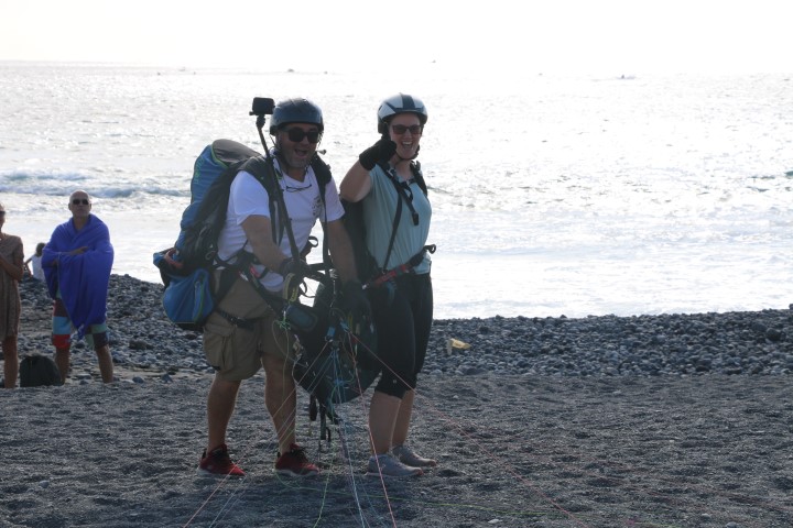 Ich beeile mich, auch in die Luft zu kommen. Herrliche Bedingungen! Ordentliche Thermiken, aber nett gleichmäßig. Für Piloten: 3,6 m/s2 max. Steigen. Dummerweise habe ich meinen Anzug nicht angezogen! Über 1.200 Meter wird es in der Luft dann doch kühl. Deswegen mache ich mich dann auf den Weg zum Ufer. Denn wir landen in Front von RE! Michèle hat sich in die Strandbar gesetzt und macht Landefotos.