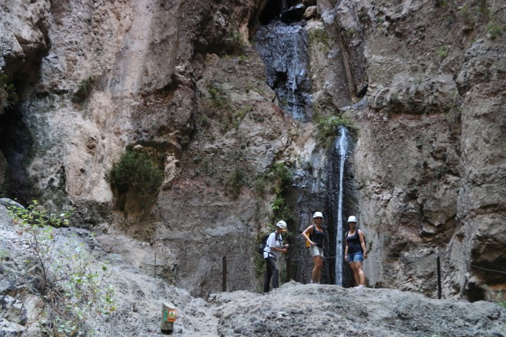 Der Weg selbst ist eine Wander-Autobahn. So gut ausgebaut, das hatten wir noch nie. Die Tafeln waren so gerade noch lesbar, die Sonne bleicht alles aus. Das Schwierigste ist das permanente Tragen des Helms. Ok – am Ende haben wir auf den 3 Kilometern bis zum Wasserfall und dann die 3 Kilometer wieder zurück insgesamt fast 1.000 Höhenmeter gemacht. Es geht schon 3 Schritte rauf und dann 2 wieder runter. Die Aussichten sind prima und der letzte Kilometer ist dann wirklich eine beeindruckende Schlucht. Hier hängen die Felsen teil über und wenn da mal ein Stein runter kommt… Hier ist der Helm vielleicht nicht ganz sinnlos. Am Wendepunkt wird der Wasserfall gebührend bewundert.