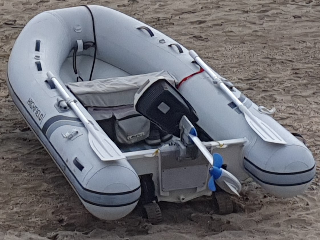 Das ist ein etwas aufwändigeres Verfahren. Das Dinghy liegt ja hoch und trocken auf dem Strand. Wir haben am Heckspiegel Rollen, aber die sind recht klein. (Größere habe ich damals nicht bekommen. Und umbauen hatte ich keine Lust.) Solange der Untergrund hart ist, rollt es gut. Aber im weichen Sand versinkt es. Dann müssen wir zu zweit ziehen. An der Wasserlinie dann werden die Wellen abgeschätzt. Irgendwann dann das Kommando: Los! Noch ein Stück reinziehen, dann das zweite Kommando an Michèle: Rein. Sie hüpft dann achtern rein und gleich nach vorne. In der Mitte hinsetzen. Ich versuche das Dinghy in Richtung zu halten und noch mal abzustoßen. Dann bin ich auch drinnen. Die beiden Ruder ausklappen und ein paar Schläge durch die Brandungszone. Noch ein paar Schläge, um nicht zurück geworfen zu werden. Dann endlich kann der Motor runter geklappt werden und wir fahren ein paar Meter raus. Sobald es „sicher“ ist, werden die Räder hoch geklappt und die Ruder gesichert. Nun endlich kann es raus gehen, denn wir sind in einem durch Steinmolen geschützten Bereich des Ufers. Auf „hoher See“ dann Kurs RE. Das ist bald ne halbe Meile, dauert dann schon noch mal 10 Minuten.