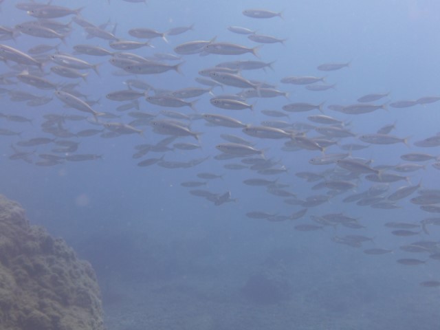 Gut – ein besonderer Tauchspot ist es nicht. Aber die üblichen Verdächtigen sind da. Was man halt im Atlantik an jeder Küste so findet. Besonders sind heute mehrere stationäre Fischschwärme. Das hab ich so auch noch nicht erlebt. Sind wohl Spanier – und machen gerade Siesta. Wenn man mitten rein schwimmt, dann gehen sie schon so ein wenig auf die Seite. Aber sonst hatte ich immer nur vorbei ziehende Schwärme. Wir fotografieren wie die Wilden. Da muss hinterher wieder eine Menge aussortiert werden.