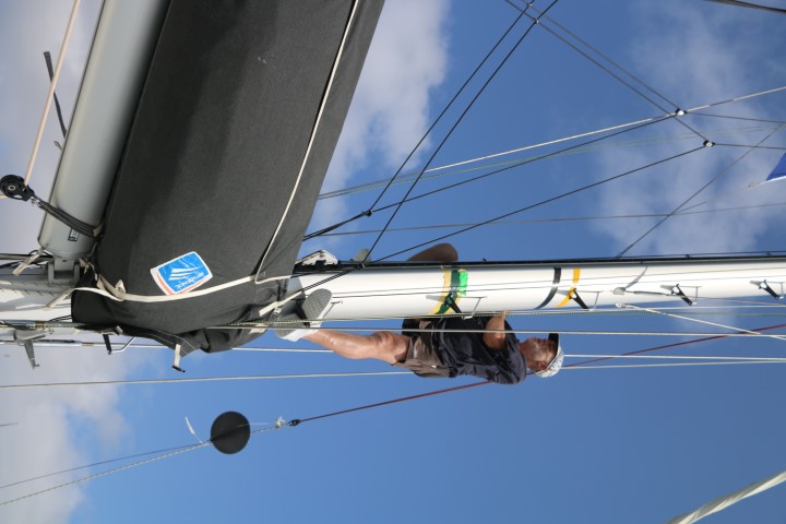 An Bord gibt es immer was zu tun. Die gestern erstandene Farbe kommt heute an den Mast: Wir bekommen für jedes Reff einen bunten Streifen an Mast und Segel. Stehen die aneinander, ist das Reff richtig drin. Gelb = 1. Reff, Grün = 2. Reff, schwarz = 3. Reff. Bei langsam auffrischendem Wind wird im Segel nur noch Schwarz aufgebracht. Dann kommt das Segel lieber weg.