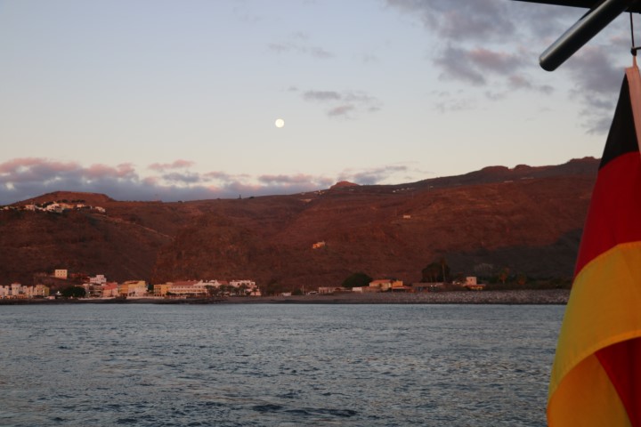 Der Mond geht über La Gomera unter. Die Sonne neben Tenerife auf.