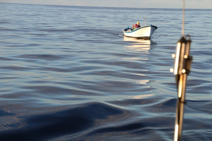 Ein Fischer auf Kurslinie.Achteraus die Bucht von Santiago.