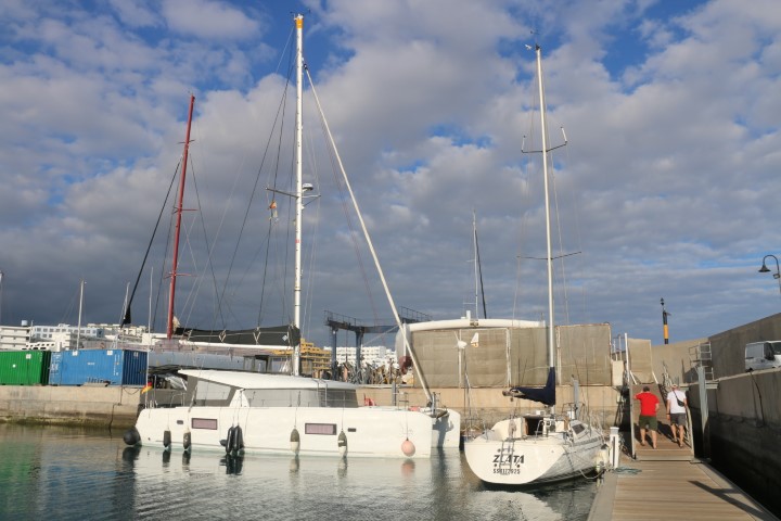Einfahrt und Anlegen gestaltete sich – fast – einfach. RE liegt „ganz hinten“. Da ist auch der Einschnitt, in dem Boote aus dem Wasser gehoben werden. Gerade wird ein kleines Motorboot ins Wasser gelassen. Als ich noch ca. 10 Meter entfernt bin, kommt der langsam frei. Noch 5 Meter. Da will der noch schnell zwischen RE und der Kaimauer durchschlüpfen. Seine Frau zetert rum. Ob sie ihm sagt, dass er doch lieber warten soll oder ob sie mich auffordert, wegzufahren? Ich kann kein Spanisch! Und der Wind würde mich sowieso in seine Richtung drücken. Also: Ich lege jetzt erst mal an. Und in einer Minute kann er dann raus. Senkrecht an den Steg, backbord achtern die Leine fest – der Marinero hilft prima. Und mit dem Fixpunkt drehe ich RE dann linksrum, dass die Backbord-Seite an den Steg kommt. Dazu gebe ich dann ordentlich Gas. Was heißt, dass ich ordentlich Schraubenstrom produziere. Das interessiert den Motorbootfahrer nicht so recht. Kaum reiht die Lücke, fährt er los. Und wird dann von meinem Schraubenstrom gnadenlos an die Kaimauer gedrückt… Nun – ich muss mich jetzt erst mal um meine Vorleine kümmern. Und danach ist er weg.
