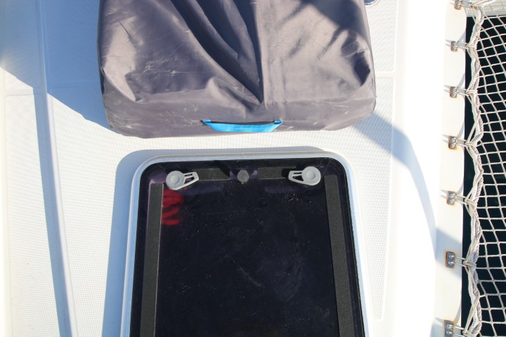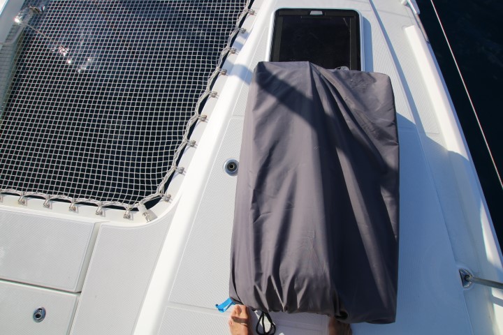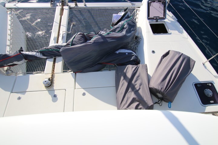 Das Tagesprogramm hört sich einfach an: Segel verstauen. Die beiden neuen Focks sollen „unter Deck weg“. Natürlich in der Vorpiek. Da müsste so gerade noch Platz neben den Notfall-Utensilien und dem Spi und dem Para und… Oh! Es sind doch eine Menge Sachen darin! Problem sind die doch recht kleinen Luken der Vorpieks. Warum Lagoon bei einem so großen Schiffchen keine ordentlich großen Luken für die ansprechend große Vorpiek einbaut: Sicher mach das noch mal ein paar Euro mehr Gewinn. Und die Leidtragenden sind die Eigner. Doch – mehr als 90% der Produktion geht wohl in den Charter. Das zählt so was nicht. Also ans Werk: Zunächst aber muss ich feststellen, dass mein Augenmaß gut ist: Die Packen gehen so nicht durch die Luke! Das erste Bild zeigt dann auch: Es sind min. 5 Zentimeter zu viel. Auch wenn man es diagonal probiert!