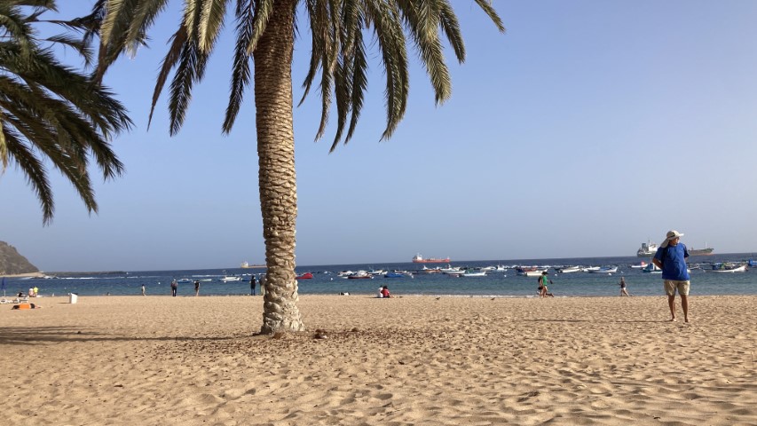 Auf meinen Wunsch hin geht es nun nach San Andres zum Sahara-Strand. Den haben die wirklich in den 70er Jahren mit ein paar Schiffsladungen aus der Sahara hier her geholt, damit sie den Touristen auch „gelben“ Strand bieten können. Ansonsten haben die Kanaren ja eher, wenn überhaupt, schwarzen (Lava-)Strand zu bieten. In der Strandbar gibt es einen Kaffee. Dann geht es zurück.
