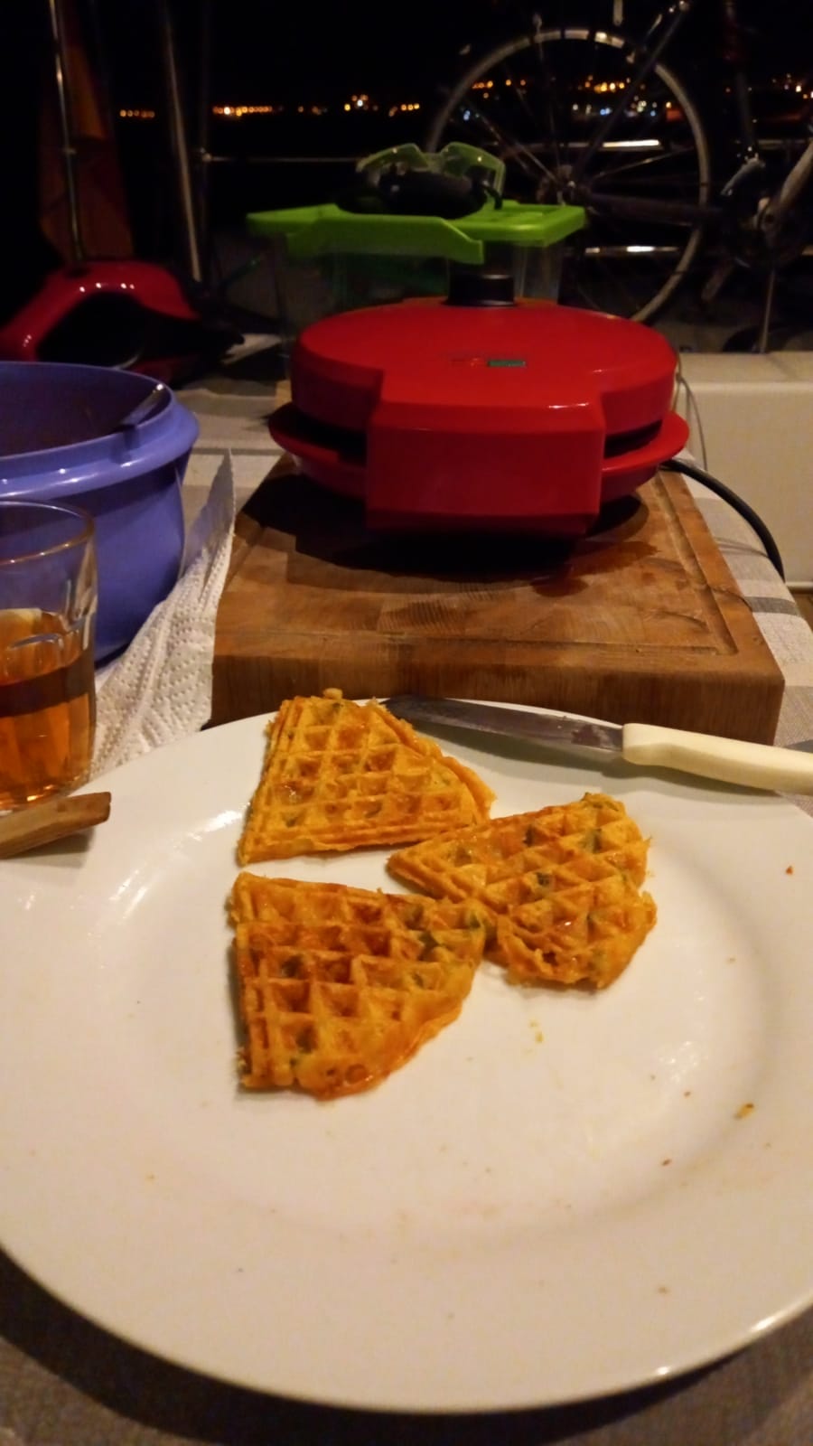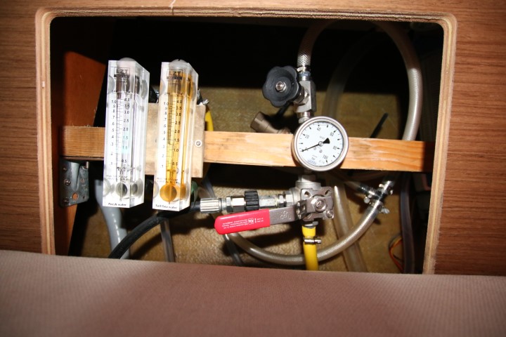 Erst mal wieder durch den Testschlauch 10 Liter durchlaufen lassen. Test: Süß. Dann erst mal wieder den Clean-Tank auffüllen. Umschalten: Produktion! Wir machen nun endlich unser eigenes Wasser. Nach 55 Minuten zeigt der Wasserzähler 75 Liter an. Das kommt mit dem Durchflussmesser überein. Der zeigte ca. 1,4 Liter pro Minute an.