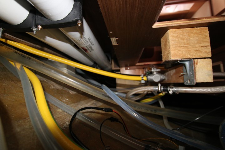 An Bord die Installation fertig machen. Die Vorfilter müssen ordentlich montiert werden, die Schläuche sauber verlegt. Dann den Verteiler für das Süßwasser: Außenbords, Clean-Tank, Trinkwasser-Tank ordentlich montiert und beschriftet. Die große Leckstelle von gestern untersucht: Da war eine Dichtung in vielen Einzelteilen. Mit Pinzette rausgepult. Natürlich kein passender Ersatz an Bord. Aber ein kurzer Hochdruckschlauch: Da eine Dichtung ab und … Passt nicht so ganz. Trotzdem.