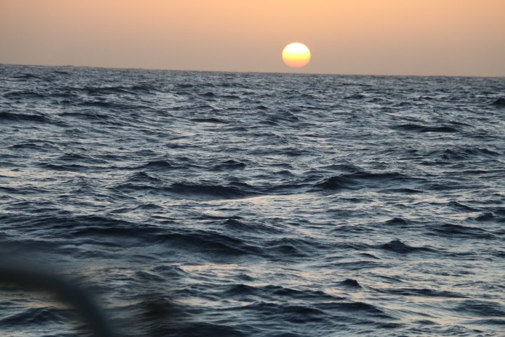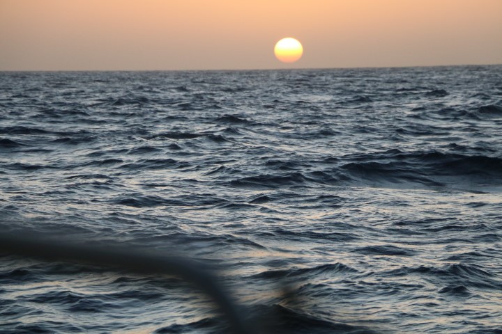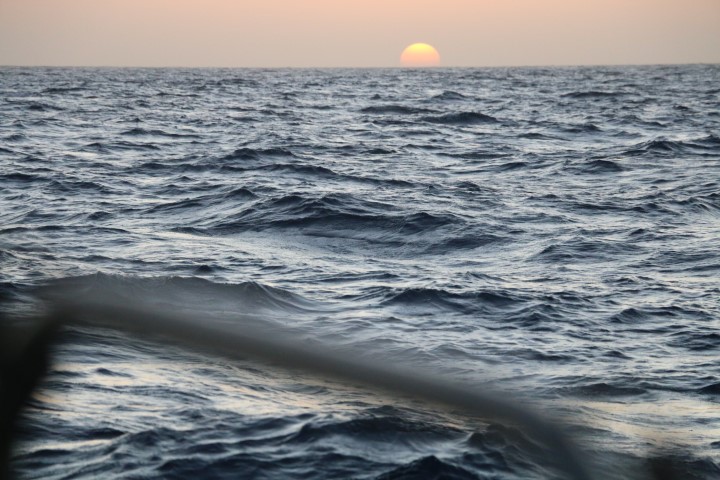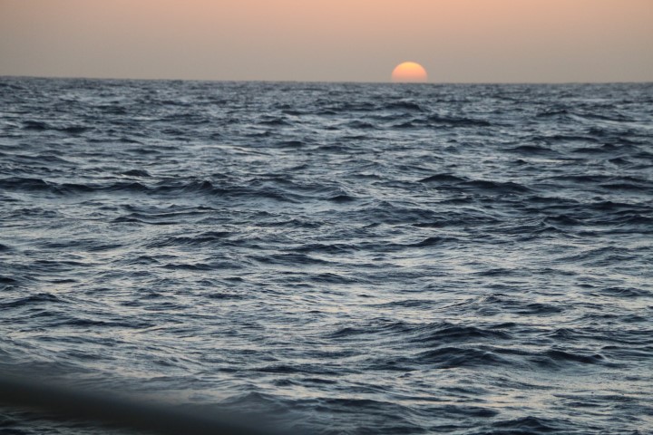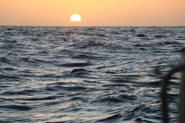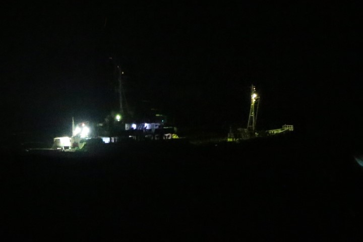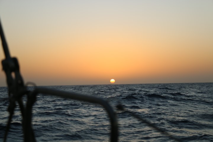 In meiner Nachtwache endlich mal was aufregendes! Ein hell erleuchtetes Schiff kommt voraus in Sicht: Kein AIS!! So beobachte ich es eine Weile, Bug rechts an meiner Steuerbordseite, das heißt alles ok! Aber er kommt näher und näher. Also Radar an und ihn vermessen. Der macht keine Fahrt! Oh – dann weiche ich mal 20° nach Backbord aus. Mit einer halben Meile Abstand passiere ich sein Heck. In den nächsten Stunden verschwindet er langsam achteraus. Was das wohl war? Nach einem Krieger sah es nicht aus. So richtig nach Fischer auch nicht. Aber ein Forscher würde doch sein AIS nicht aus machen!!??