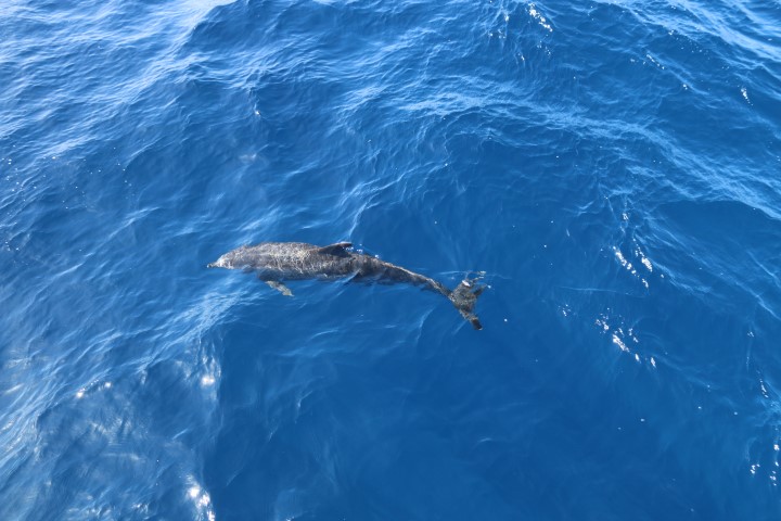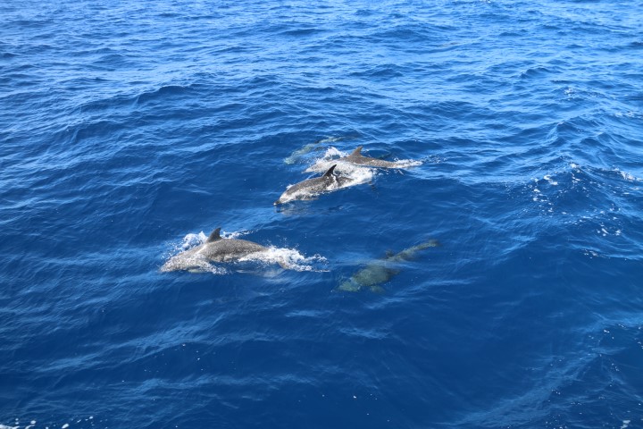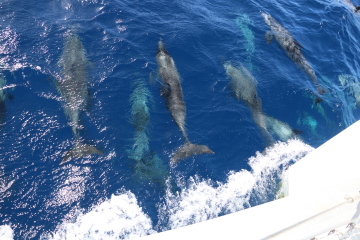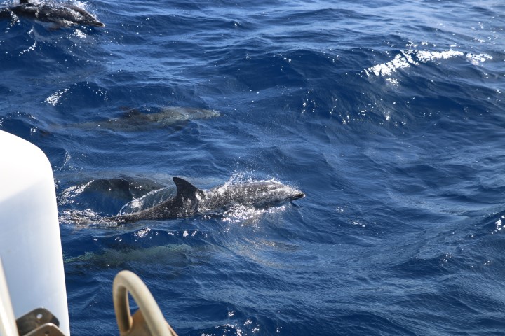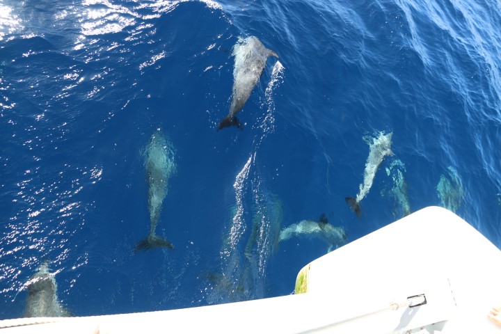 Am frühen Nachmittag dann ist das Delfin-Ensemble wieder da. Mit meterhohen Sprüngen. Immer, wenn ich keine Kamera in der Hand habe! Aber dieses Mal will ich zumindest einige Fotos machen, auch wenn keine Sprünge dabei sind… Ist es eine halbe Stunde gewesen, die sie uns so eng begleitet haben? Oder was es eine Stunde? Jedenfalls werden es irgendwann immer weniger und dann sind alle weg.