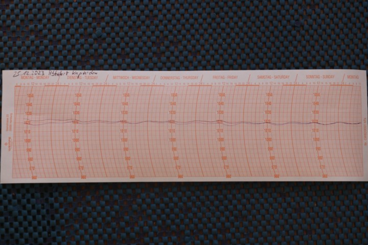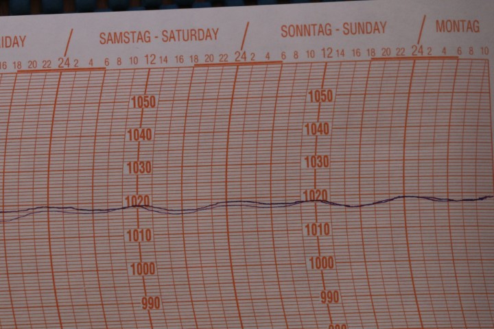 Morgens standen die „Montags-Arbeiten“ an: Die Glasenuhr aufziehen und das Barografen-Papier wechseln. In den letzten zwei Wochen hatten wir sehr friedliches Wetter. Konstant geht der Luftdruck den Morgen hoch bis zum Maximum am Mittag. Dann zurück zum Abendminimum und wieder hoch zum Mitternachts-Maximum. Jeden Tag. Und die Kurve vom Sonntag Mittag auf Montag Mittag liegt exakt auf der von letzter Woche! Es ist nicht nur sehr friedlich, sondern eben auch sehr gleichförmig, das Wetter hier! Während in Deutschland Supermassenregen halb Norddeutschland unter Wasser setzt, ein ordentlicher Kälteeinbruch nun alles gefrieren lässt, haben wir hier morgen wieder bestes Sonnenwetter!
