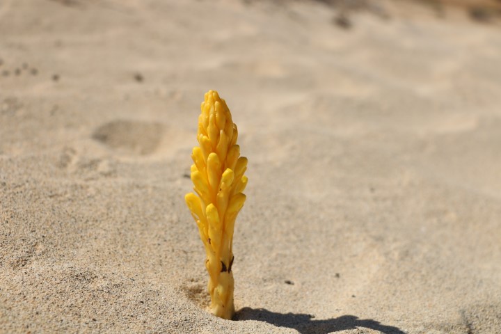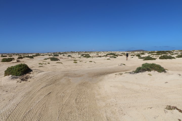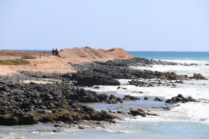 Anschließend verläuft sich der Weg und wir stapfen durch den Sand. Was im ersten Moment nach schönem, weißen Strand aussieht, zeigt sich bei näherer Betrachtung als Mischung aus weiß und schwarz. Ist eben doch alles vulkanischen Ursprungs.