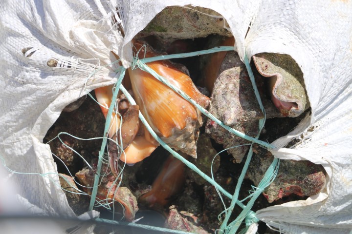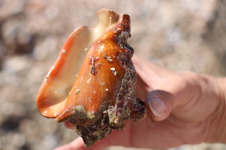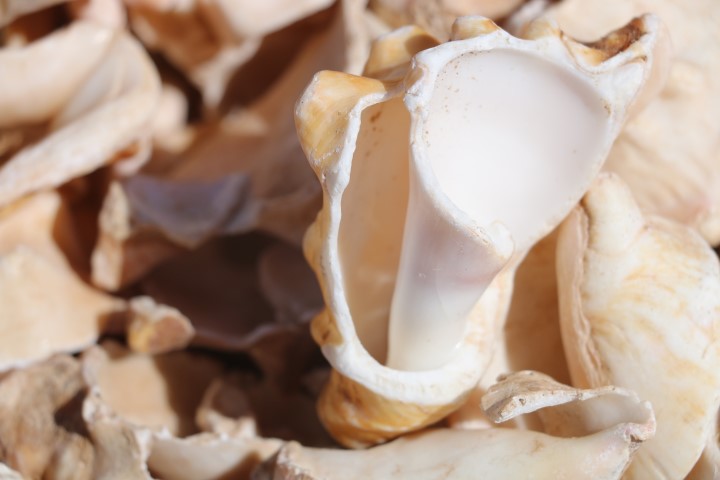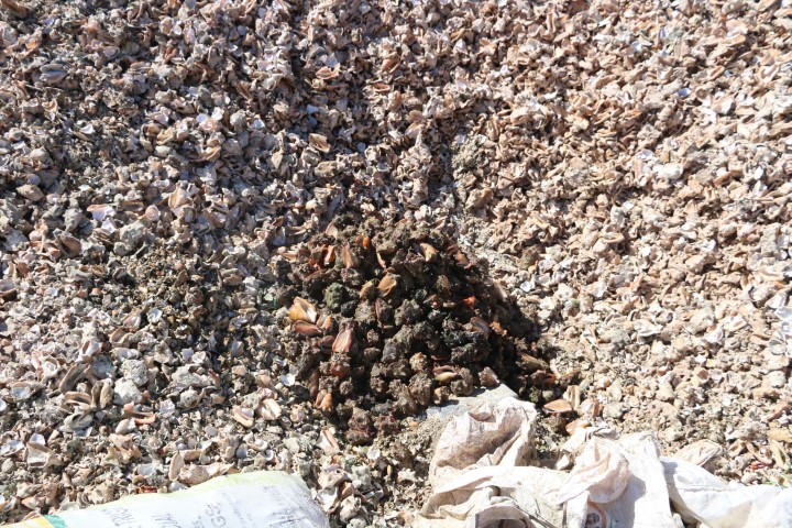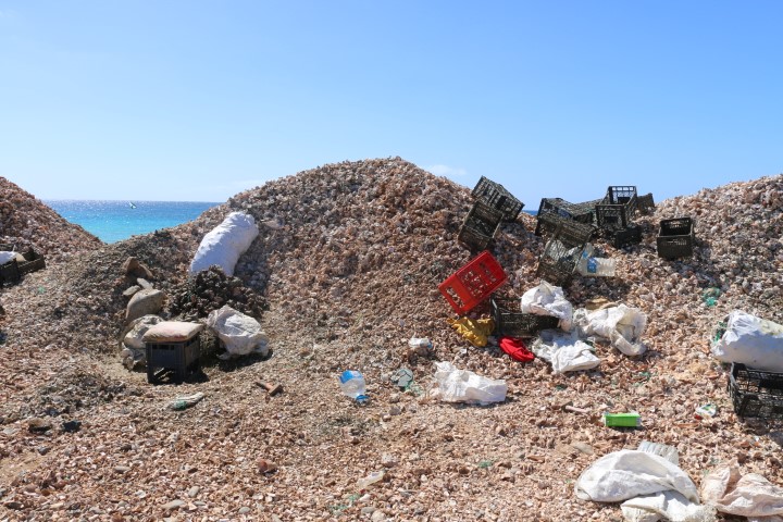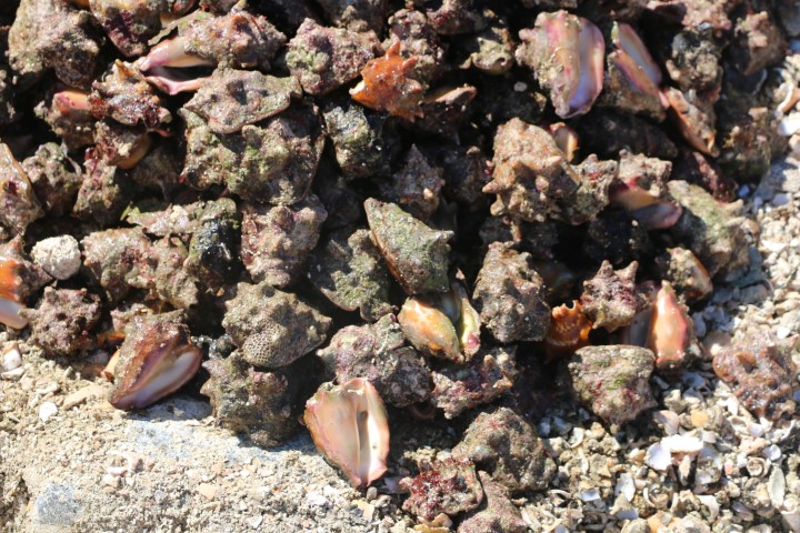 Im Städtchen kommen wir bei der Suche nach einem großen Mülleimer an der Zahnarzt-Praxis vorbei. Muss natürlich fotografiert werden. Raus aus dem Städtchen sind wir auch gleich beim „Shell Cemetary Beach“. Offiziell ist es angeblich illegal, diese Muscheln zu sammeln. Aber das Muschelfleisch ist in den Restaurants wohl beliebt… So werden sie in großen Säcken angelandet, ein paar Meter weiter gefahren und da dann aus der Schale geholt. Das zu beobachten dauert. Die Säcke sind schnell abgeladen, aber dann beginnt ein umständliches Treiben, den Arbeitsplatz herzurichten. Nebenbei verliert ein Wagen bei der Abfahrt seine Ladung: Taucherflaschen, Kisten und allerlei sonstiger Kram liegen im Sand auf und neben der Straße! War für dieses Schlagloch wohl zu schnell! Alles eilt hin, um wieder aufzuladen. Dann ist eher Mittagspause. Endlich beginnt jedenfalls einer! Ein, zwei gezielte Schläge und das Muschelfleisch kann raus gezogen werden. Da hängt dann zwar noch ein wenig von der Schale dran, aber da kommt Nr. zwei dazu und macht die Feinarbeit. Der Schalenberg wächst!