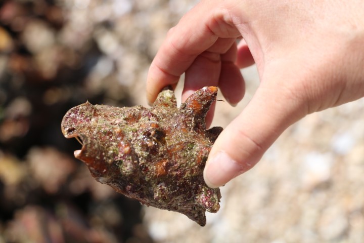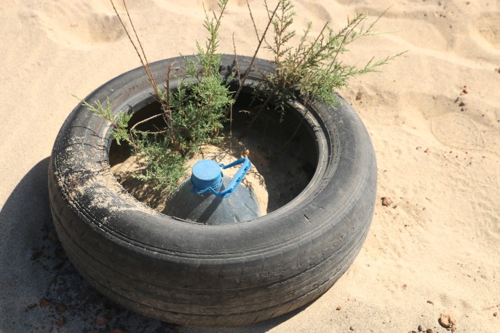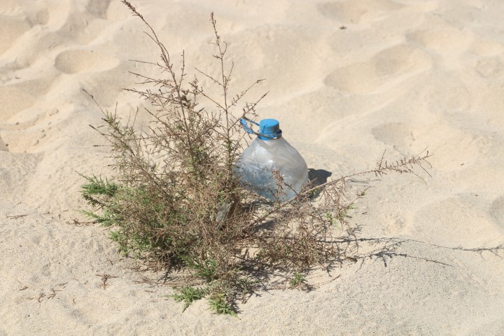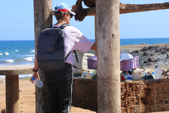 Ein ?Monument? hat es Michèle angetan: Ist es doch dekoriert mit Plastikmüll. Und so gibt es noch ein wenig dazu: Ein paar Schritt runter zum Wasser und schon hat sie wieder genug, um das Kunstwerk zu erweitern!
