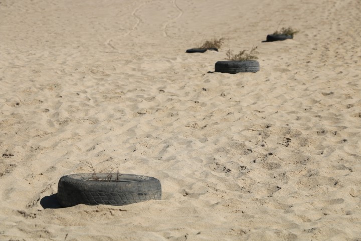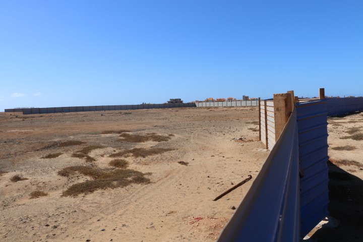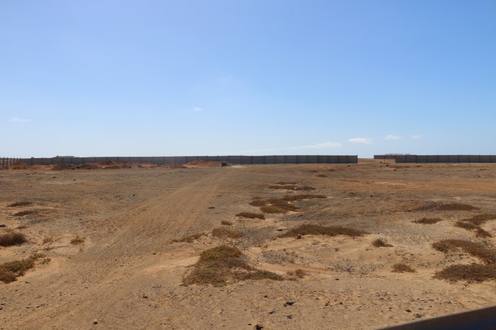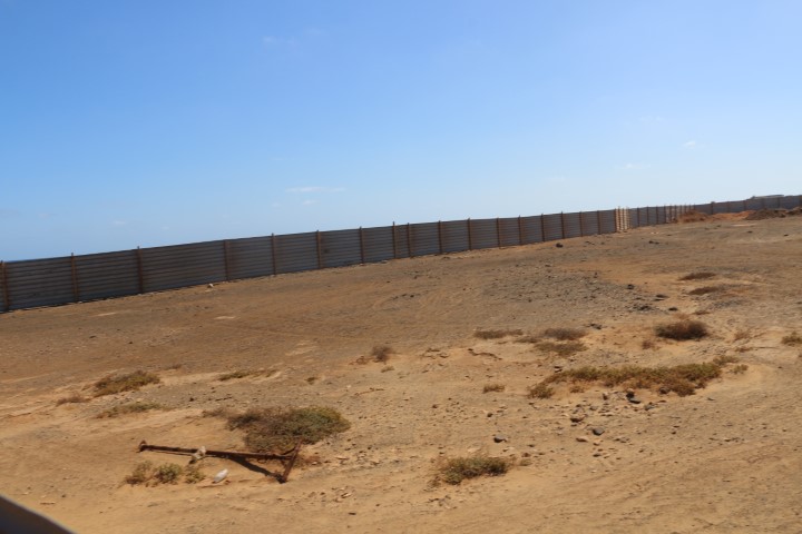 Wir machen uns zum südöstlichsten Punkt auf. Da ist nichts Besonderes, außer, dass es jetzt nach Norden geht. Zur Linken sind zwei Areale mit hohem Wellblechzaun abgesperrt. Neugierig versuchen wir einen Blick zu ergattern. Zu hoch, kein Loch zum Schauen! Am Ende halte ich den Fotoapparat über den Zaun. Rechts, mitte, links ein Foto: Und es ist nichts dahinter als genau die gleiche grau-braune Ebene als rund um uns….
