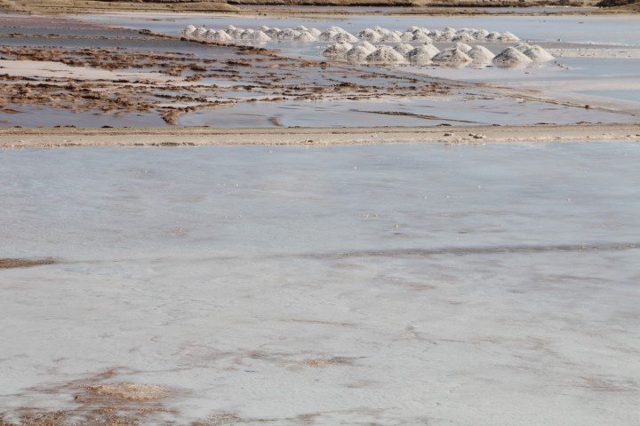 Je mehr wir uns den Salinen nähern, desto öfter treten wir auf „Salzstraßen“. Das kennen wir schon aus Namibia: Ordentlich Salzwasser auf den Sand und es entsteht eine betonharte Oberfläche. Das lässt sich dann wieder schön laufen. Bei den Salinen scheint uns, dass die auch nicht mehr sehr intensiv betrieben werden. Ein einzelner junger Mann hackt noch eine Fläche auf. Ansonsten sind mehr Souvenirverkäufer hier als Arbeiter. Nette Salzkristalle. Werden dann auch gerne als heilwirksam angepriesen. Und würden alle schlechte Energie aufsaugen!
