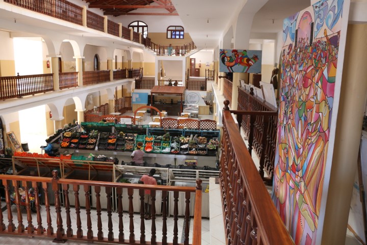 Zurück in der Stadt geht’s zum Mercado municipal. Obst und Gemüse einkaufen. Und oben in der Galerie gibt es wunderbar bunte Bilder! Über ein Cafe – sehr zu Michèles Erstaunen mit Kaffee mit veganer Milch! - geht es dann zurück zum Pontão und an Bord.