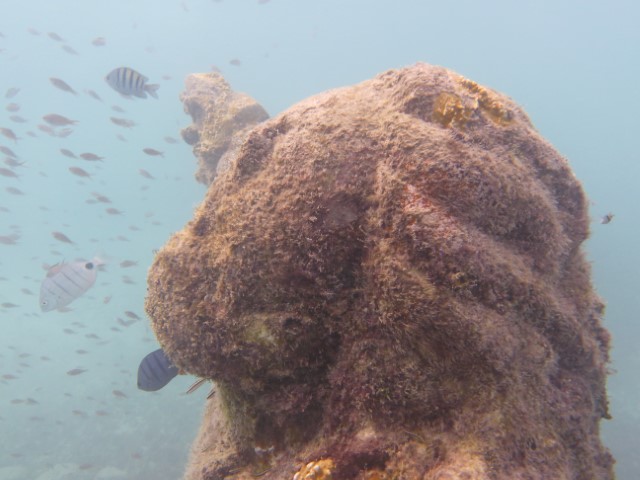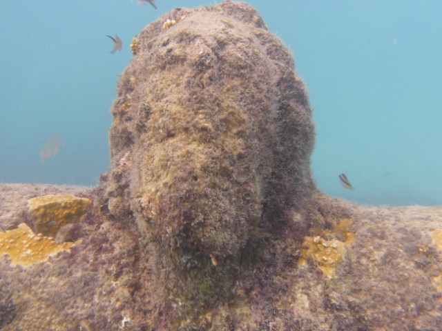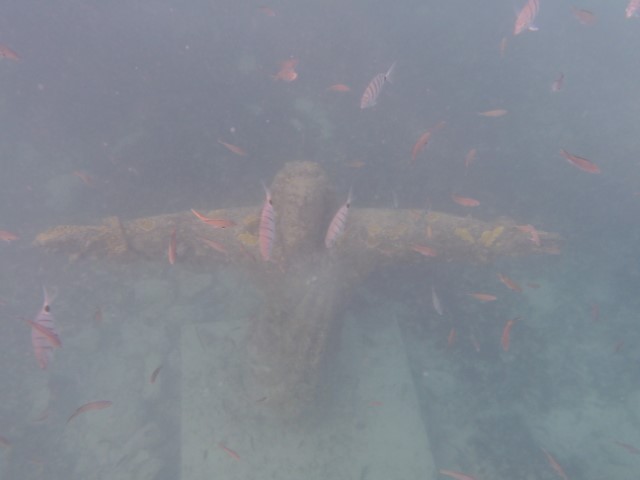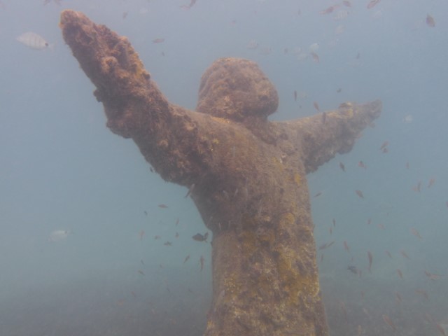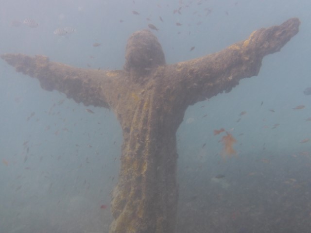 Da steht eine Statue im Wasser: Eben Christus. Gar nicht sooo kein. Gut! Dann muss ich auch noch mal ins Wasser. Und damit löst sich das Rätsel, was die Schnorchelgruppen hier machen und warum die Spaßboote immer hier ankern...