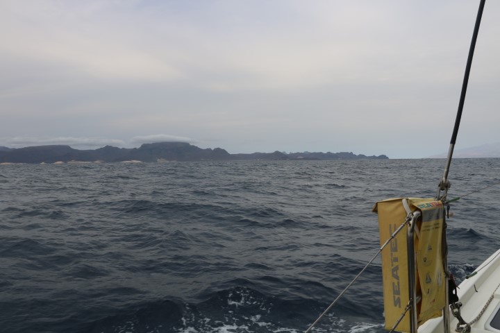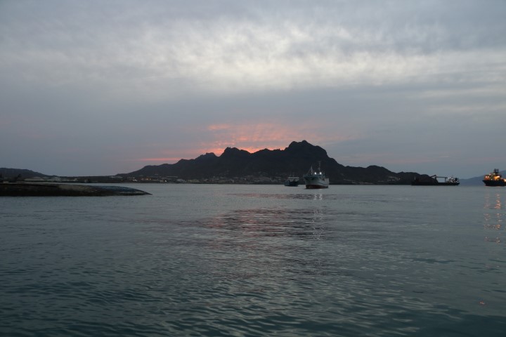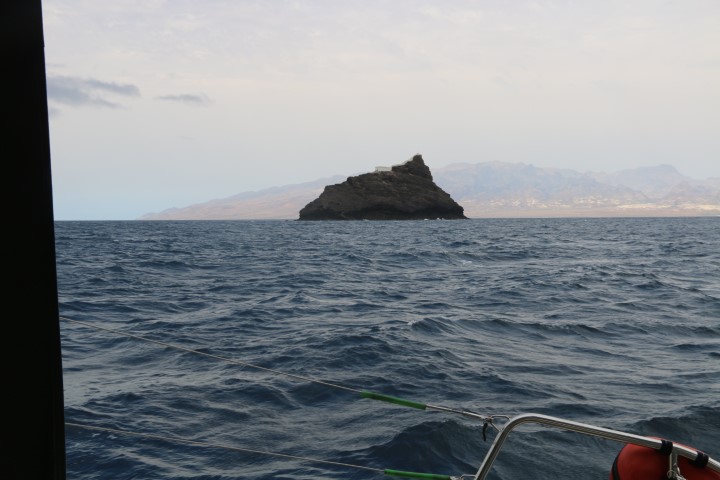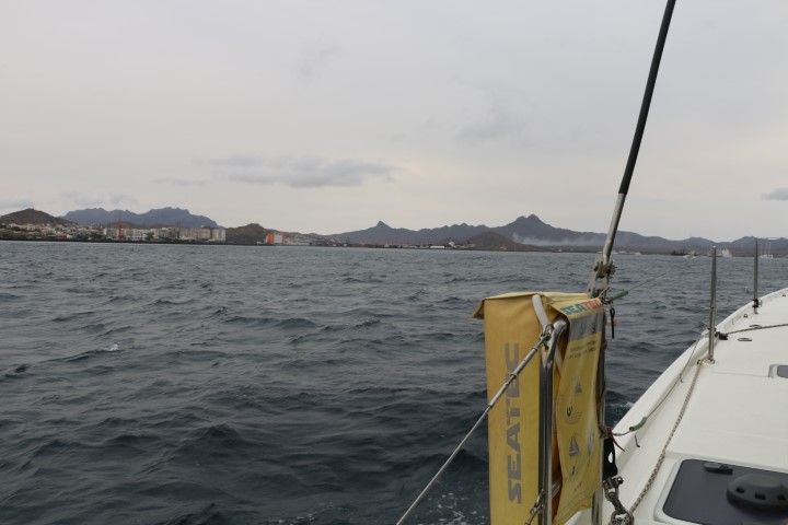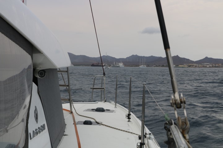 Ansonsten ist von der Überfahrt nicht viel zu berichten. Ich hatte 26 Stunden kalkuliert und am Anfang wareb wir zu schnell. Nicht nur, aber auch deshalb hatten wir gestern vor Sonnenuntergang gerefft. Das Reff 2 schüttel ich dann zum Wachbeginn aus. Gehe auf Reff 1. Nun machen wir wieder muntere Fahrt. Und gegen 10 Uhr beginne ich mit der Zielfahrt. Eine kleine, vorgelagerte Insel ist so gut zu sehen und ein anderer Katamaran geht zwischen Insel und „Festland“ durch. Also hinterher. Groß geht runter, die Fock geht in Passatstellung: Also die Doppelfock wird aufgeklappt. Eineinhalb Meilen vor der Marina wird der Wind so weit abgedeckt, dass nun Schluss ist mit Segeln. Fock einrollen, Motor an. Auch nicht schlecht, denn hier liegen viele, teils recht kleine Frachter vor Anker. Michèle ist neugierig, oder wach geworden durch die Geräusche beim Segelbergen? Egal, den Anlauf machen wir zu zweit und können uns auch gleich einigen, wo wir ankern: An einigen Yachten vorbei und vor einem gut sichtbaren Wrack eines umgekippten Frachters. Schnell sind wir fest vor Mindelo! Angekommen! Und schon ein paar Minuten die erste Meldung von Land: „Ich seh Euch!“ Olaf von der KATCHOPINE lebt hier in Mindelo.