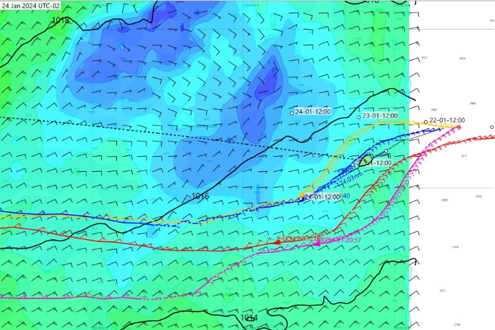 Im Norden die weißen Punkte mit Tagesdatum und 12:00 Uhr die ursprünglich geplanten Mittagsorte. Und die gesamte Wettersituation stellt sich in der Vorhersage für Mittwoch, den 24.01. mittags so dar. Plan ist es zurzeit, so ungefähr auf die blaue Linie zu gehen. Und wenn der Wind dann wirklich schwach wird, dann kommt der ParaSailor zum Einsatz. Das wird sich dann morgen früh entscheiden.