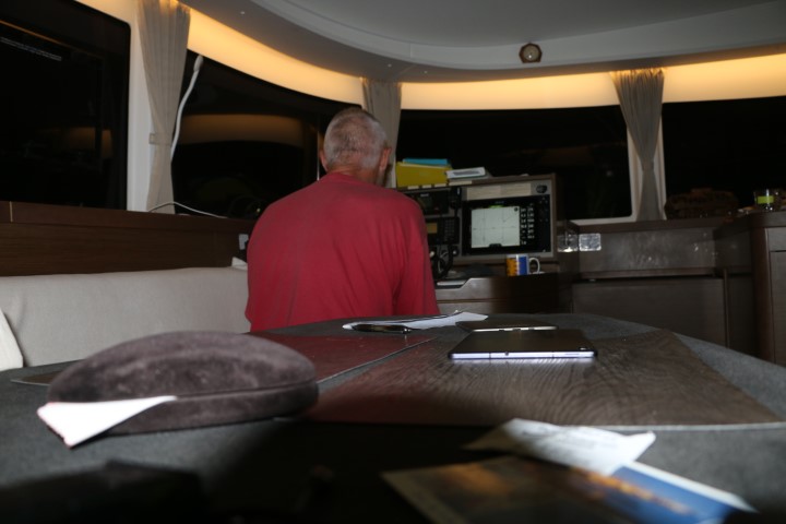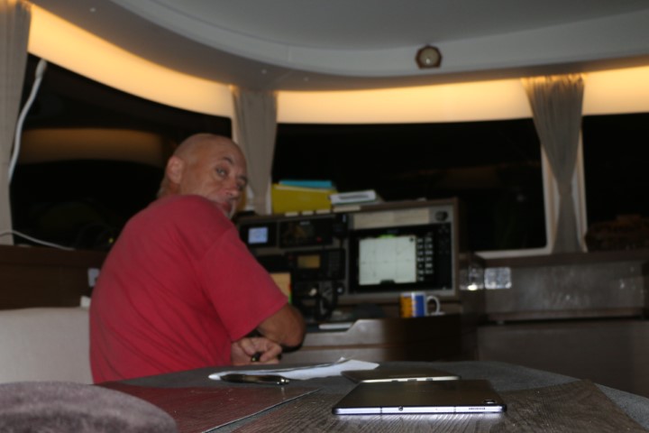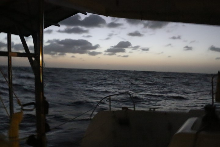 Morgens um halb acht (ist die Welt noch immer in Ordnung!) setze ich den ParaSailor. Damit haben wir mehr Möglichkeiten für den gewünschten Kurs. Mit der Doppelfock geht es nur genau von achtern +/- 30°. Mit dem Para gehen schon fast +/- 90°. Und: Bei dem schwachen Wind steht er ruhiger und zieht mehr! So vergeht der Tag. Abends um halb neun wünscht sich Michèle für ihre Wache die Doppelfock. Ja – es hat etwas aufgefrischt und wir haben in der Spitze 17 kn Wind. Das macht schöne Rausche-Fahrt. Aber sie hat Sorgen, dass es während ihrer Wache mehr werden könnte. Also nehmen wir den Para runter und setzen die Fock. (Nebenbei: Die Geschichte geht morgen nahtlos weiter….)